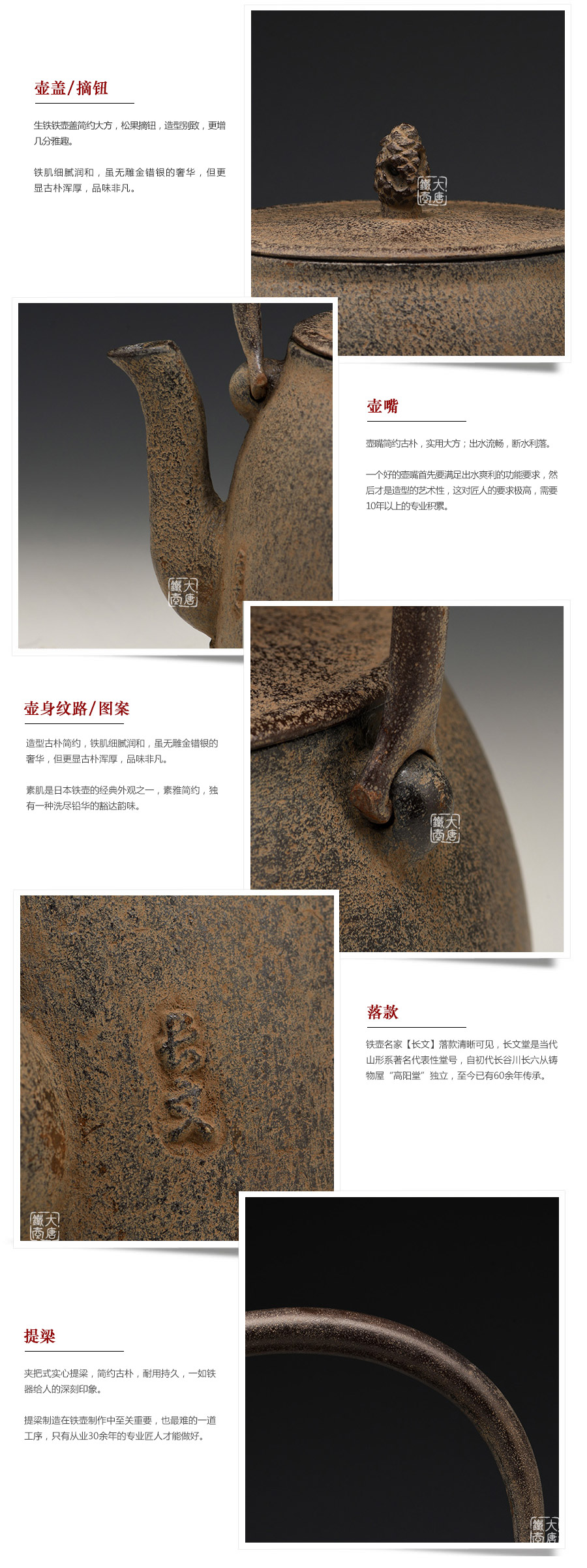 昭和27年(1952年)長文堂初代長谷川長六從鑄物屋“高陽堂”中獨立,自設工房,從事鐵瓶和湯釜的制作。昭和39年(1964年),長六逝世,其子長谷川文雄繼承父業(yè),成為二代目,并在山形縣銅町設立新的工房,取其父親名中的“長”和自己名中的“文”,合名為長文堂。此后,長谷川文雄常以藝名“長文” 制作和出席各類活動。