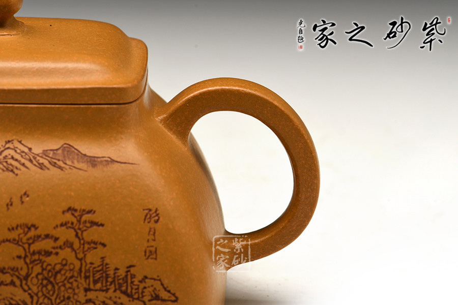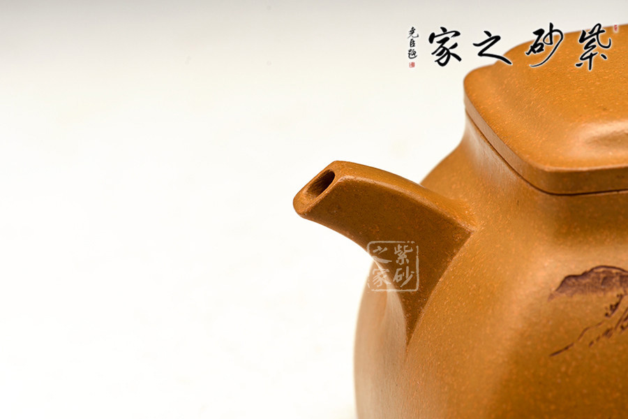 此壺在造型方面彎曲的弧度與挺括的直線完美的結(jié)合在一起,相互承載,達到方中有圓,圓中有方的感覺。