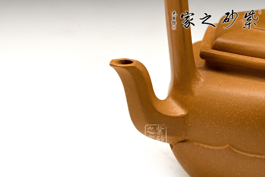 壺身線條流暢,彎曲有度。身筒與壺蓋皆為混六方造型,高矮適中,亭亭玉立;六方壓蓋蓋面飽滿,壺蓋無論往哪個(gè)方向轉(zhuǎn)度皆可與壺身相對應(yīng);一粒飽滿的壺鈕圓中帶方;三彎流壺嘴順暢利落,提梁端把過渡自然,提升了作品的空間感,且端持舒適稱手。