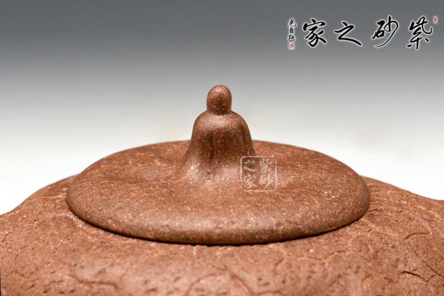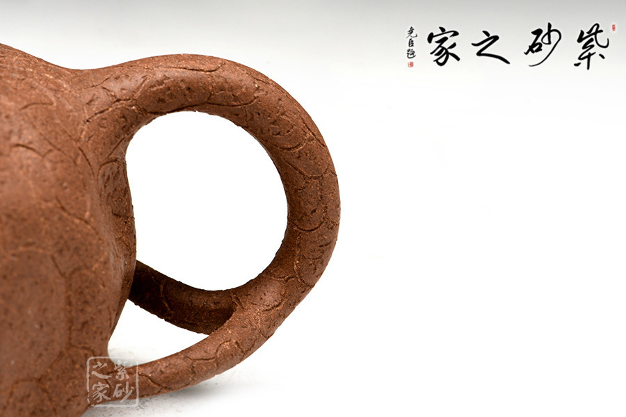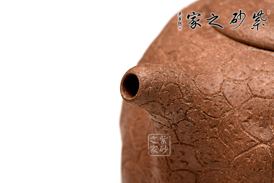 短接流嘴,精巧胥出,出水爽利;壺把仿樹枝分叉,力道恰如其分;壺蓋嚴(yán)絲合縫,氣密性佳;壺鈕近似瓜蒂造型,精工細(xì)致,古樸典雅;壺身樹紋褶皺更顯生動(dòng),足見(jiàn)作者的工藝水平之高。