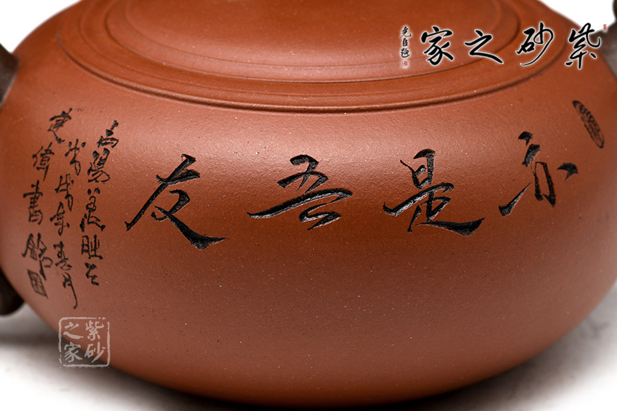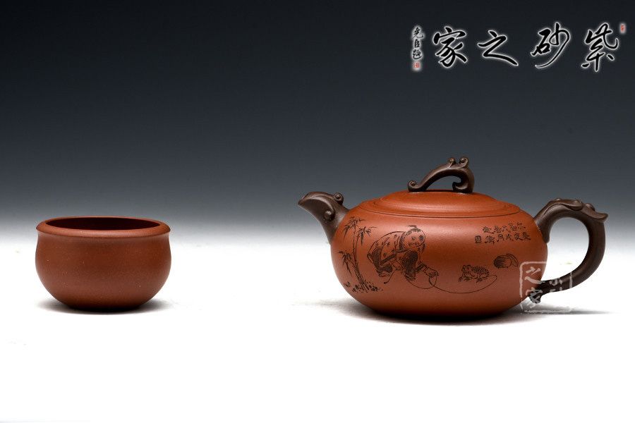 該壺刻繪皆由其父朱建偉完成。正面刻繪了一幅頑童逗蛙圖,眉眼傳神,天真可愛,場面歡快不已。背面刻繪“亦是吾友”,字體古雅大氣,藝術氣息濃厚,濃濃的生活樂趣漾然于壺上,令人回味無窮。
