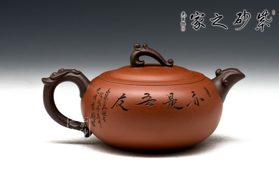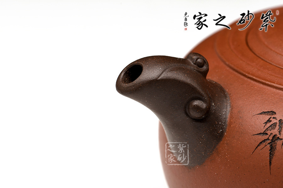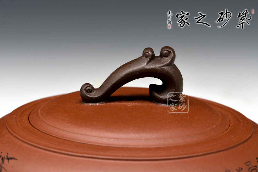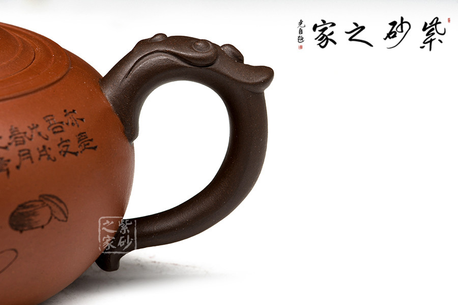朱萍萍的此款亦是吾友,造型新穎美觀,善用雙色泥工藝,壺嘴、壺把和壺鈕處皆有如意紋裝飾,儒雅精致,細細觀之,猶若蛟龍飛游其上,意趣橫生。