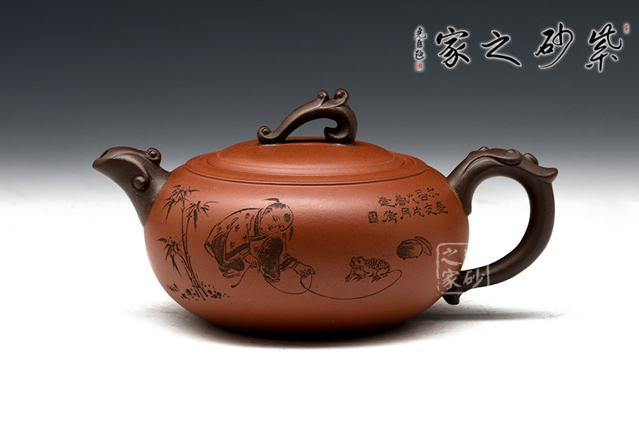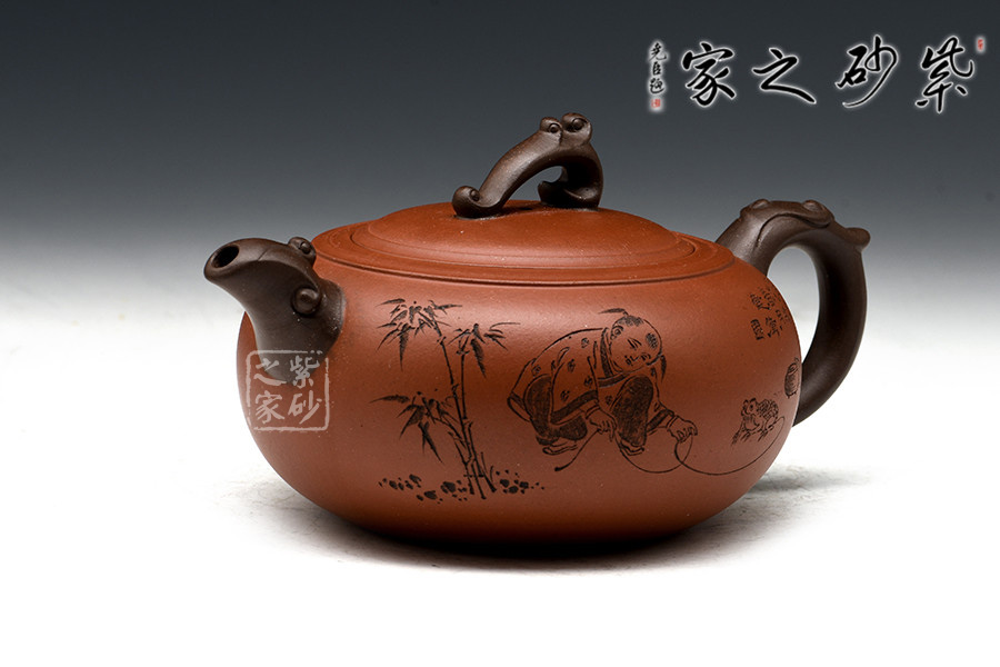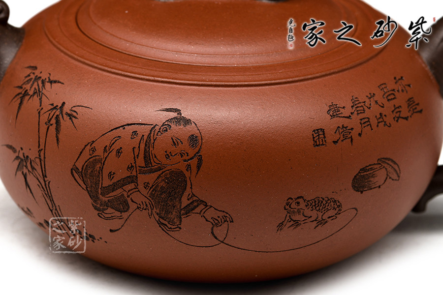 A面: 裝飾: 頑童逗趣圖 裝飾者:朱建偉 裝飾內(nèi)容: 春月里,竹林邊,小童逗趣與青蛙。觀壺重享童年無憂之樂趣