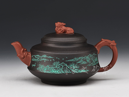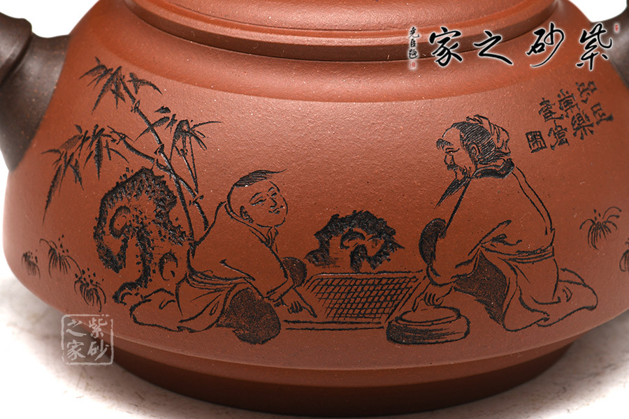 A面: 裝飾: 對弈圖 裝飾者:朱建偉 裝飾內(nèi)容: 一大一小對弈,神情狀態(tài)細膩逼真,一派生活氣息的場景躍然壺上