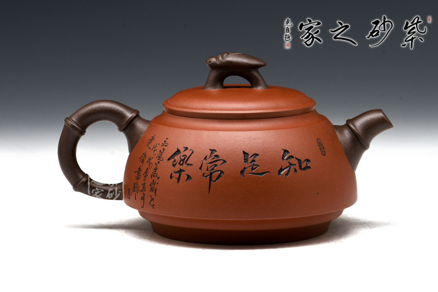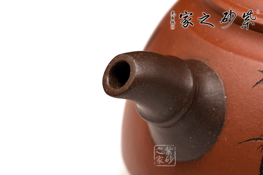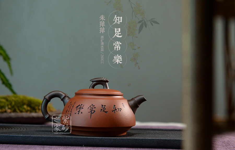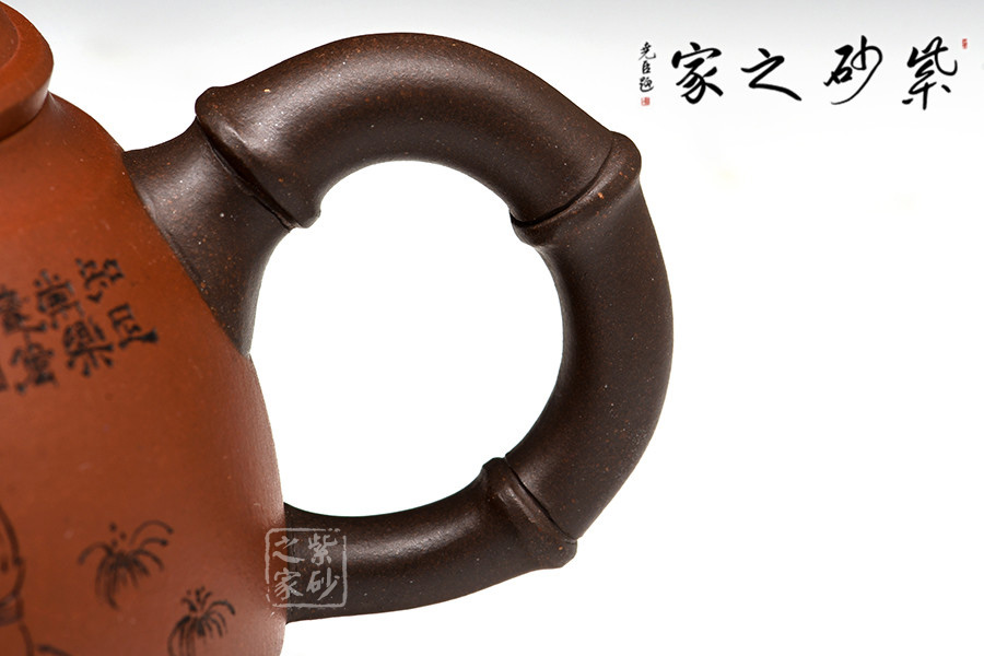這款“知足常樂”,造型新穎美觀,善用雙色泥工藝,壺嘴、壺把以竹節(jié)形狀展現(xiàn),彎曲有度,與壺身上的竹葉裝飾呼應(yīng),意趣橫生。壓蓋之上的壺鈕別致獨特,呈拱形狀,增添了此壺的氣勢。