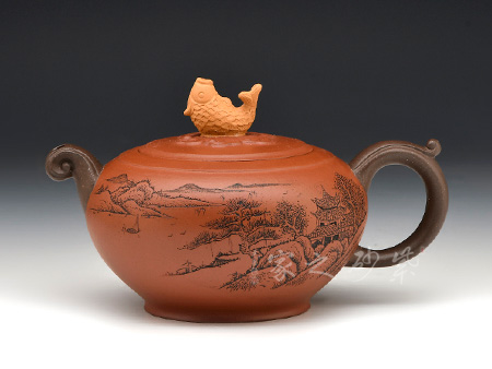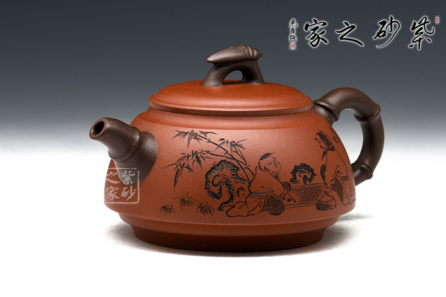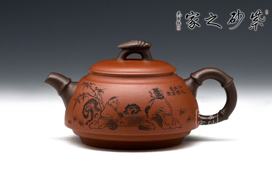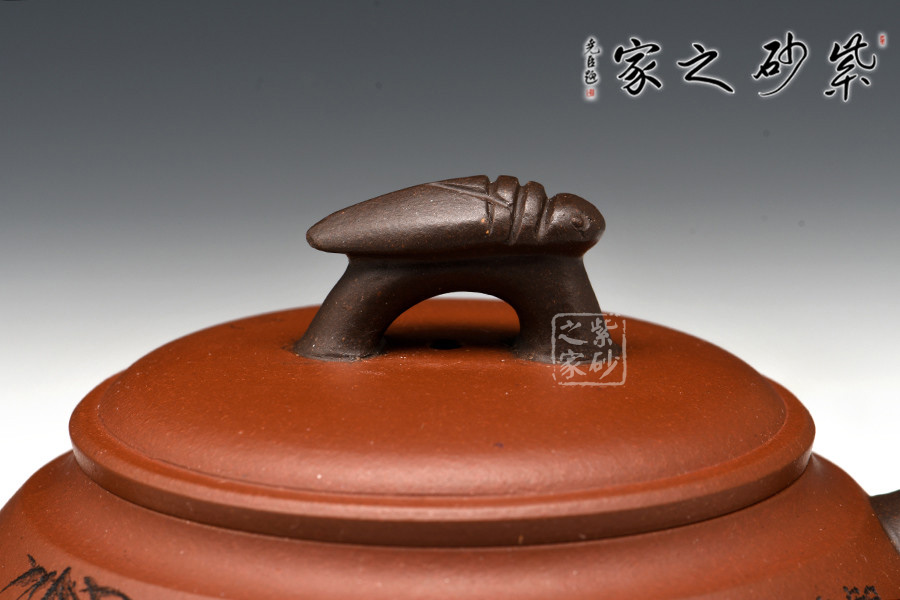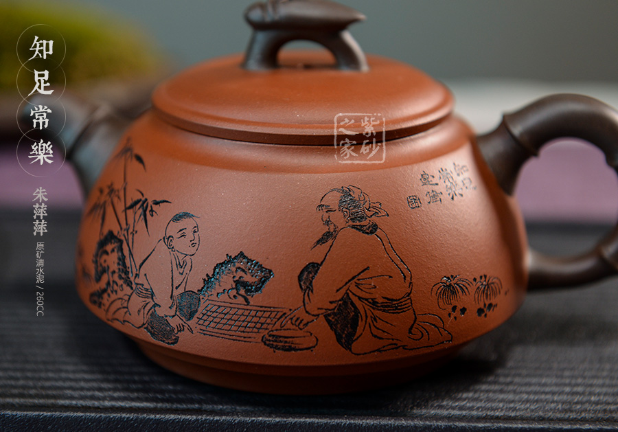 此壺壺身類似倒扣的碗狀,豐腴渾厚有質(zhì)感。壺身刻繪皆由其父朱建偉完成,濃濃的生活樂趣躍然于壺上,令人回味無窮,神往不已。