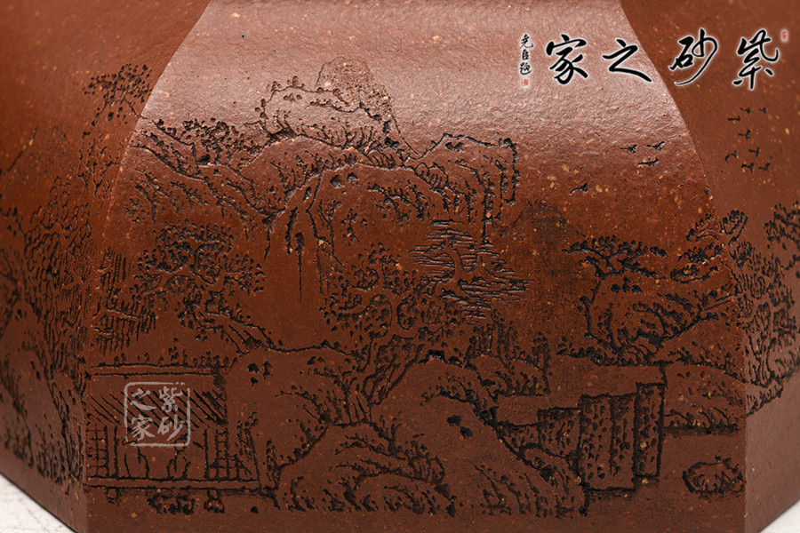 通體裝飾: 裝飾: 山水畫刻 裝飾者:徐建剛 裝飾內(nèi)容: 一派山水畫,大氣磅礴之感和山間生活氣息結(jié)合,不見突兀,更覺和諧。