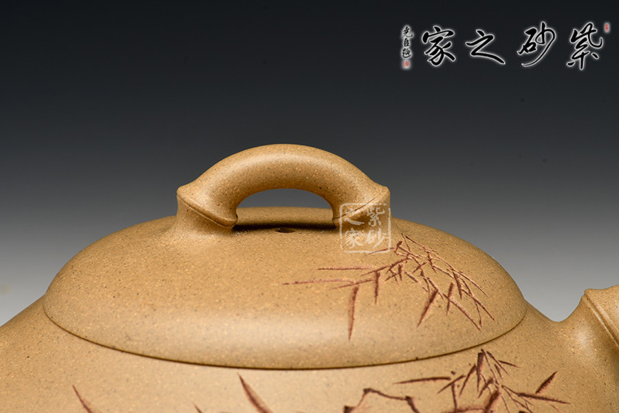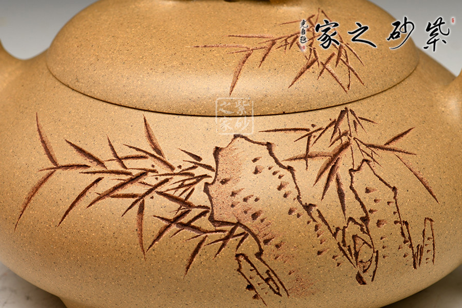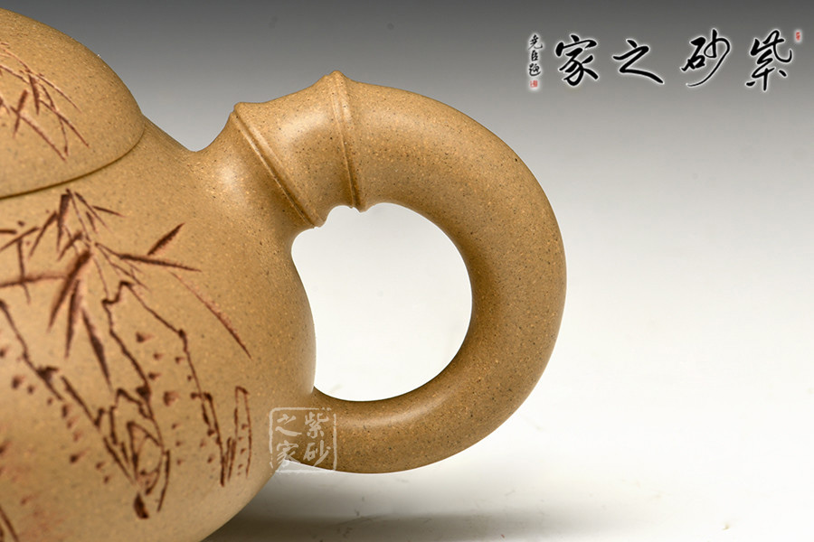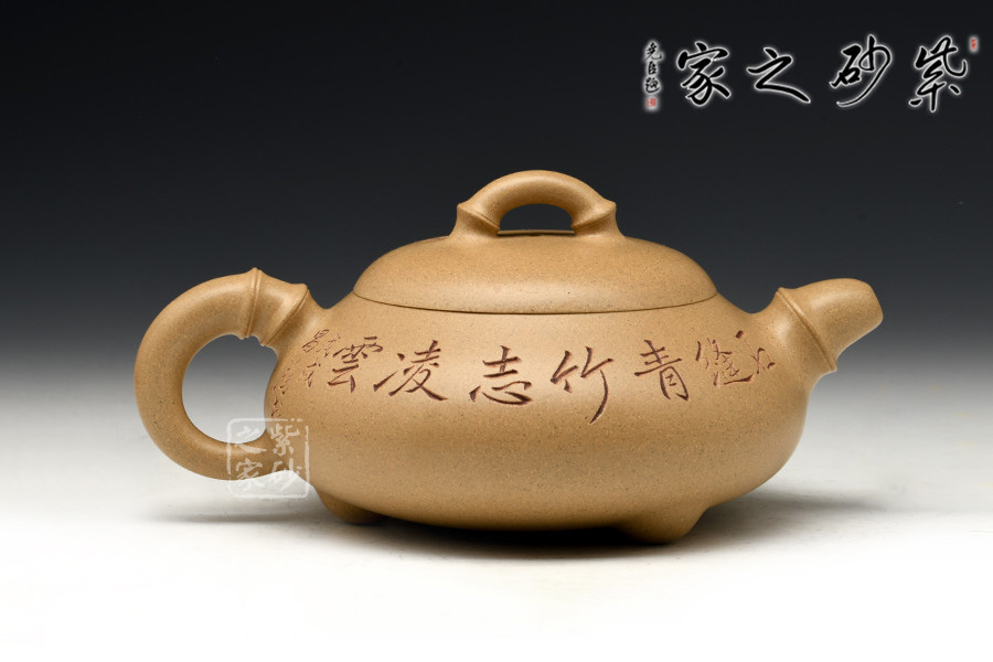 此壺是楊瑤芬老師用本山綠泥全手工制作而成,壺身采用扁腹三乳足,短嘴短把讓腹部更加突顯,壺身刻有石縫青竹,李昌鴻大師書:“石縫青竹志凌云”筆法剛勁,孔武有力。壺嘴、壺鈕、壺把都采用竹節(jié),再加上本山綠泥泥料,讓整把壺的竹的寫意更加生動和形象。壺蓋的孤度圓潤和壺身敦厚渾然天成,把玩起來讓人愛不釋手。欣賞這把壺便不由的會想到鄭板橋家喻戶曉的一首寫竹的詩,咬定青山不放松,立根原在破巖中。千磨萬擊還堅勁,任爾東西南北風。