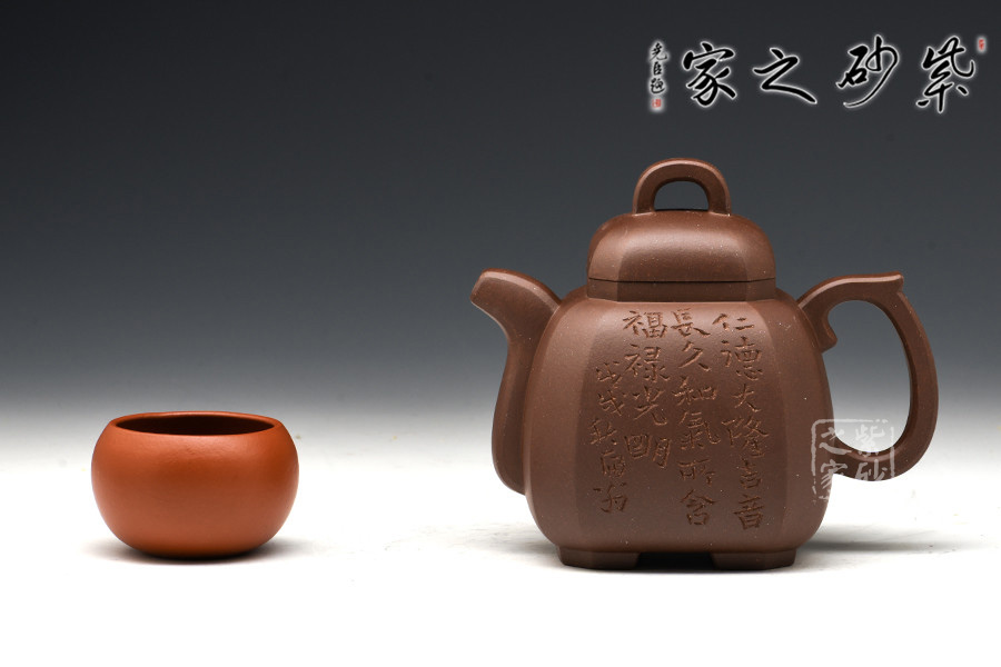 光貨離不開裝飾。俗話說“壺隨字貴,字隨壺傳”:光壺不刻字,就是一把光壺;壺上面刻了大師、名人的字,一把壺的含金量就高了,收藏價值就更高,升值潛力就更大。王福君與中國工藝美術(shù)大師譚泉海合作最多,其次是徐安碧、鮑志強、毛國強(均為中國工藝美術(shù)大師、中國陶瓷藝術(shù)大師)。