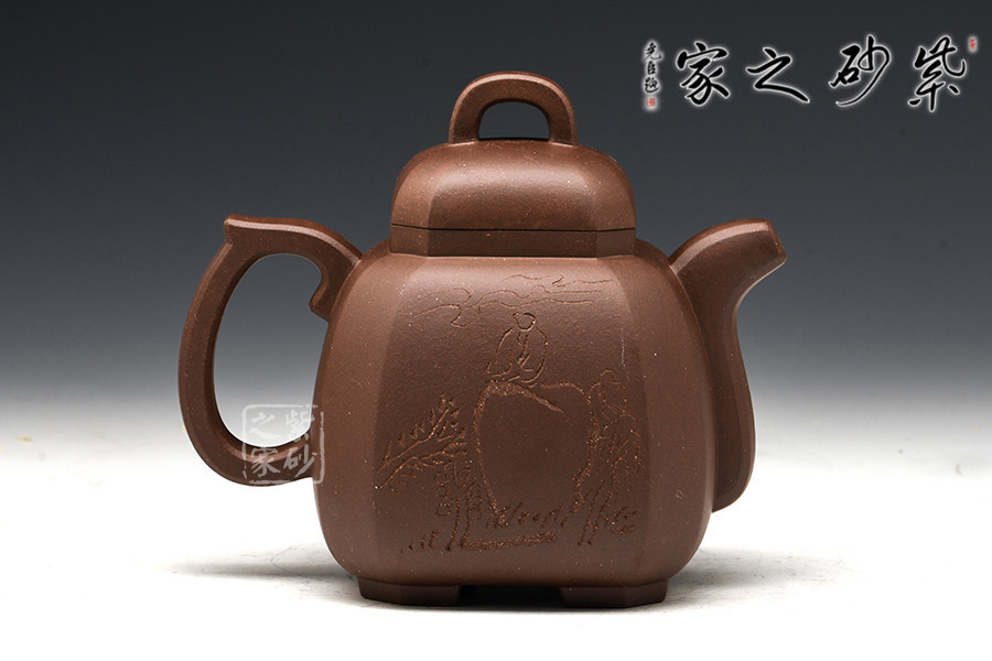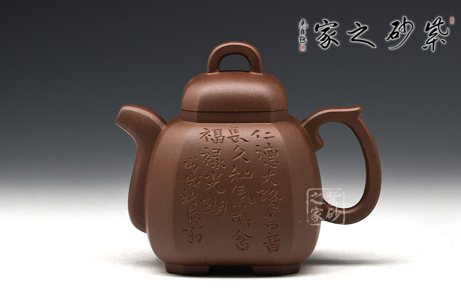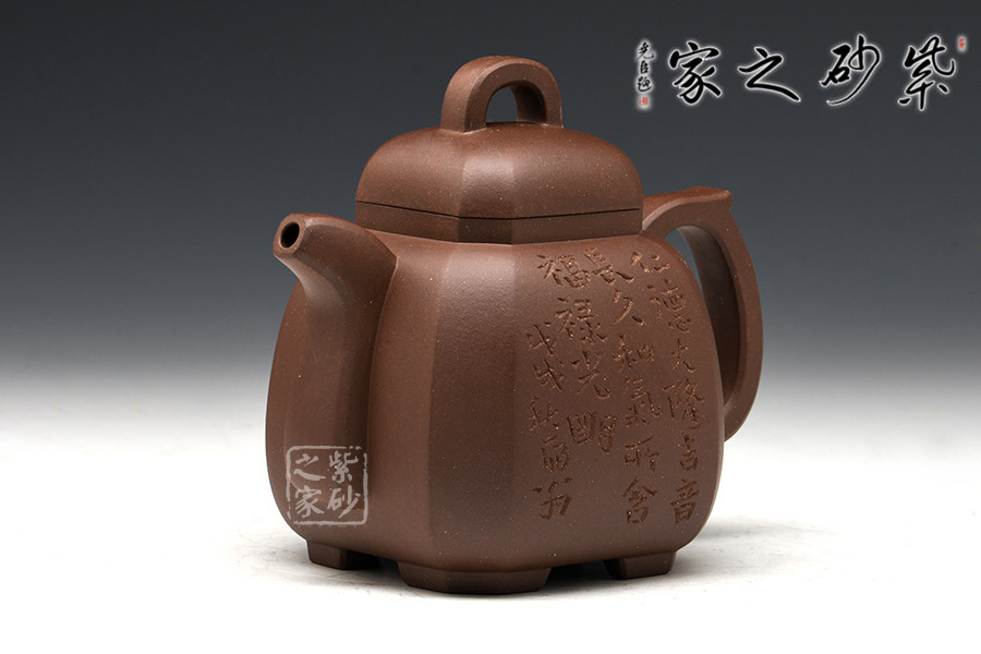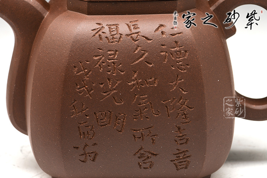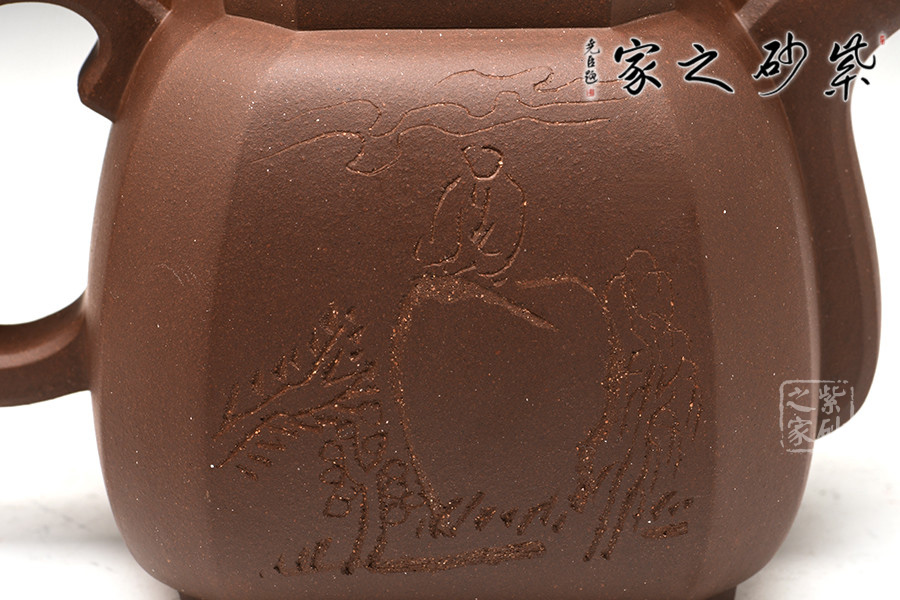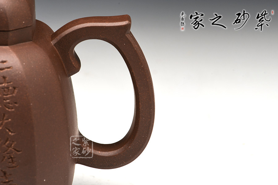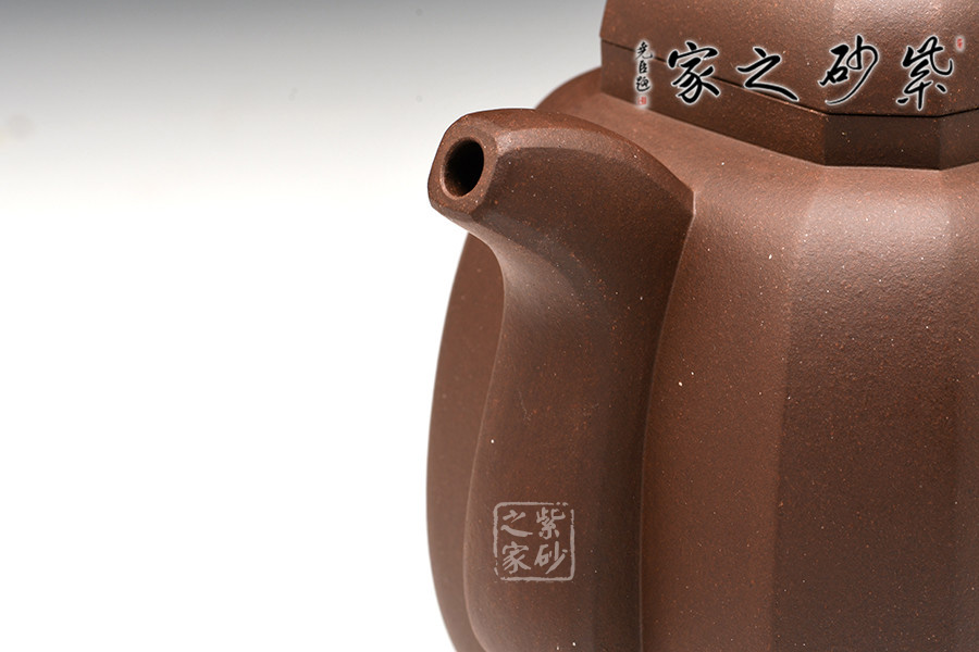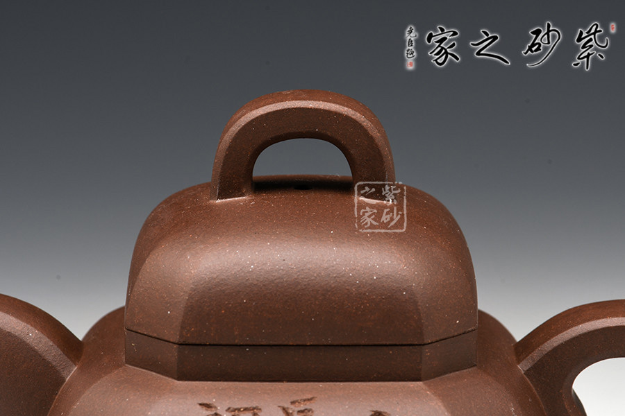 此壺造型嚴(yán)謹(jǐn)周正,壺身為八方體,塊面大小相同,鈕、蓋、肩、身、底變化規(guī)正有序、全身貫通。角、線、面節(jié)奏起伏,整齊劃一,張馳有致,氣度渾厚而挺秀。