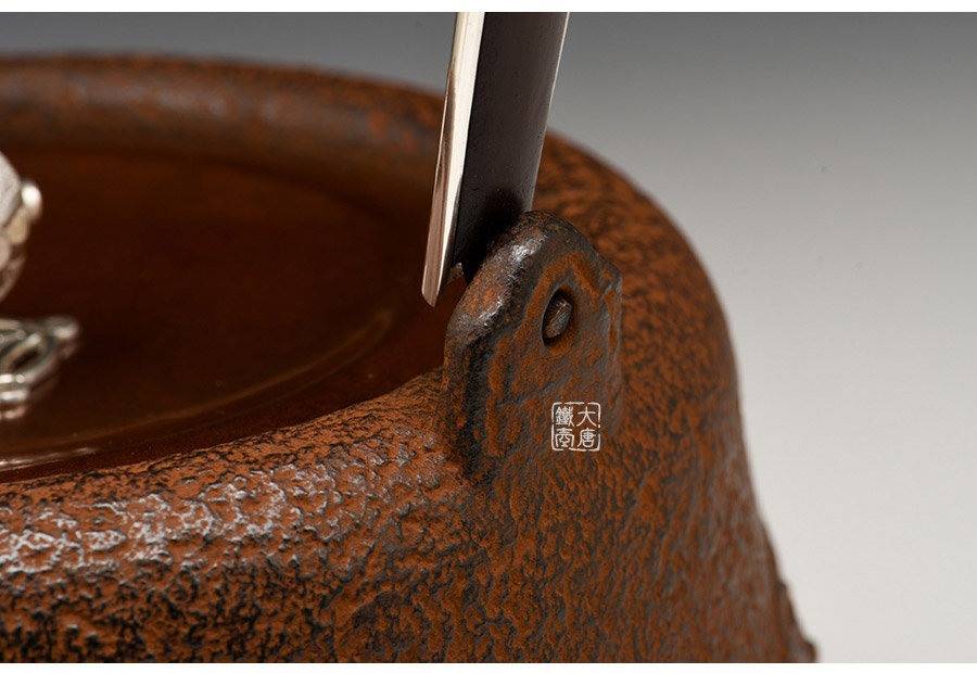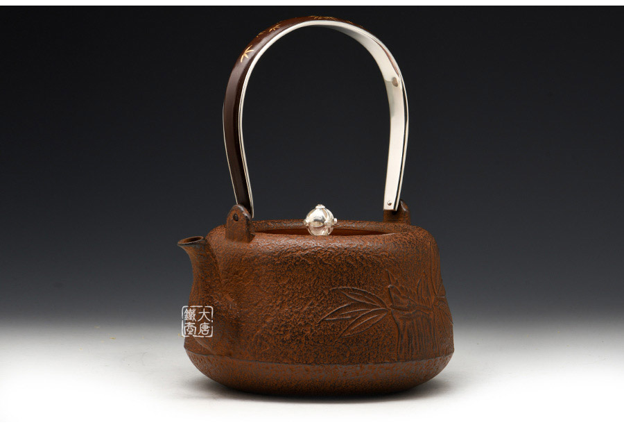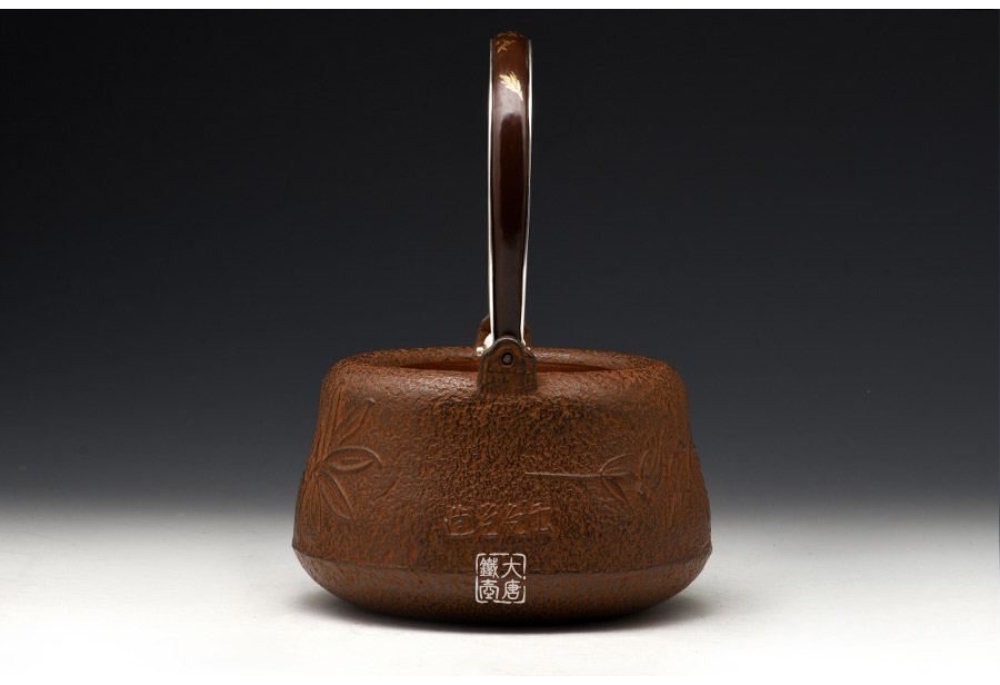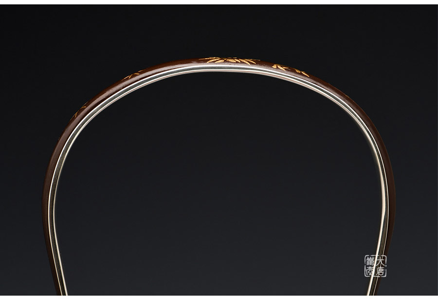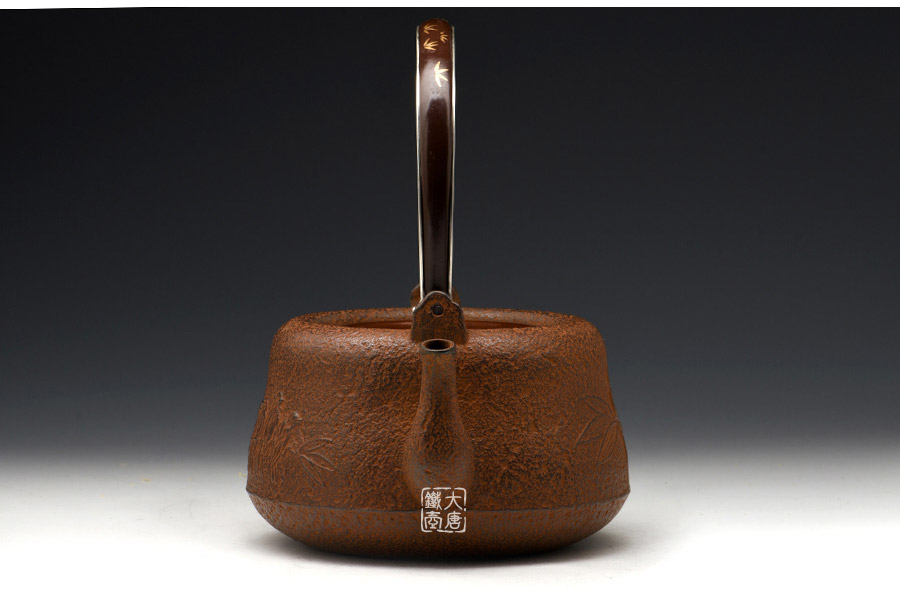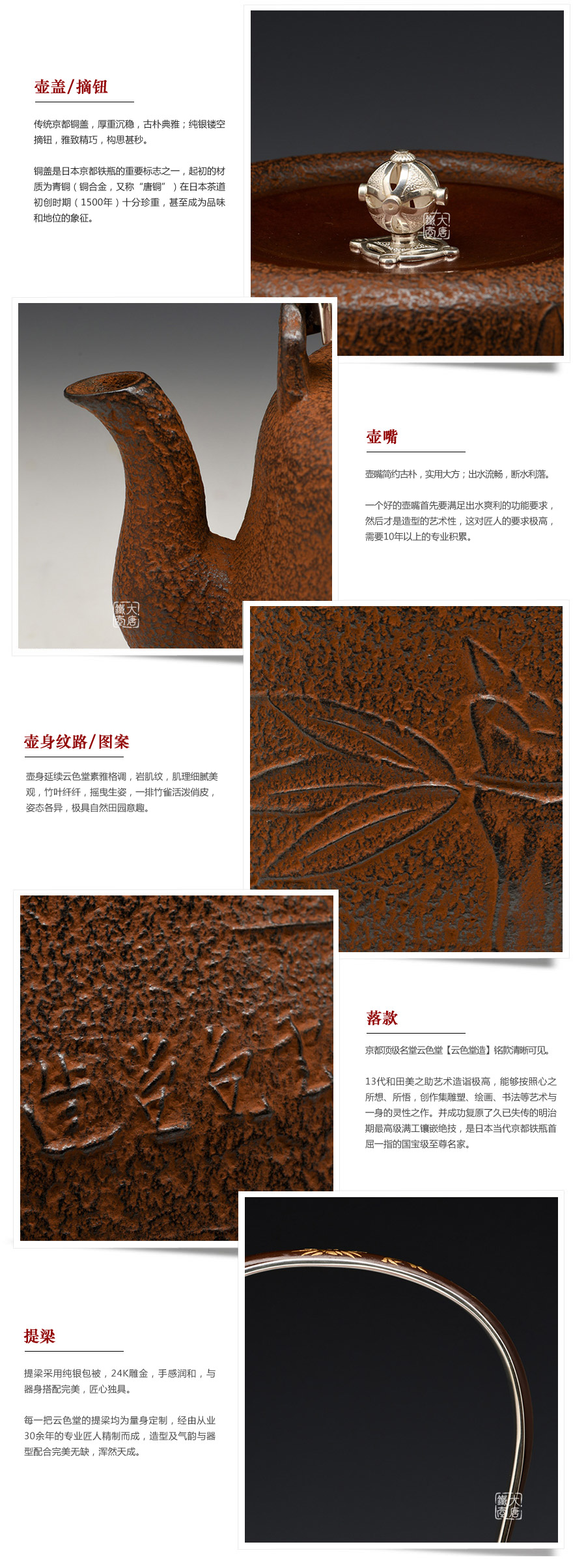 云色堂的鐵壺以豐美的裝飾技巧最為人稱道,描金及鑲金技術(shù)十分成熟。紋飾圖案的線條借鑒了日本古典瓷器的樣式。同時(shí)在一些細(xì)節(jié)的構(gòu)建上,云色堂也不惜使用珍貴的材料來彰顯他華貴的氣質(zhì)。在眾多堂口的鐵瓶中,這種特色使得其作品有很強(qiáng)的辨識(shí)性。