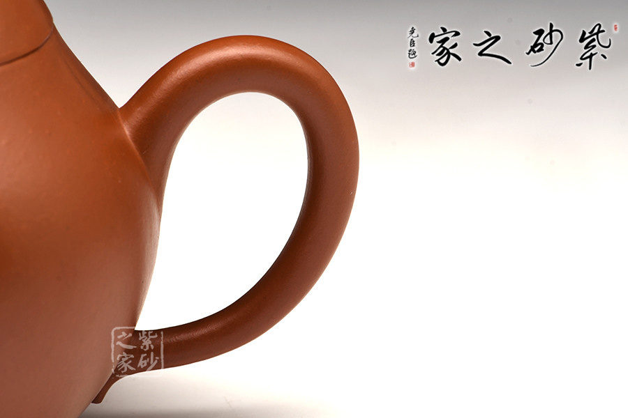 此壺為傳統(tǒng)孟臣梨形,以朱泥為胎,器身飽滿,猶蘊骨力;蓋面渾然一體,扁珠鈕高挺,耳圓形壺把,三彎流嘴。整體比例協(xié)調(diào),端莊而規(guī)整,線條流暢,耐人尋味。