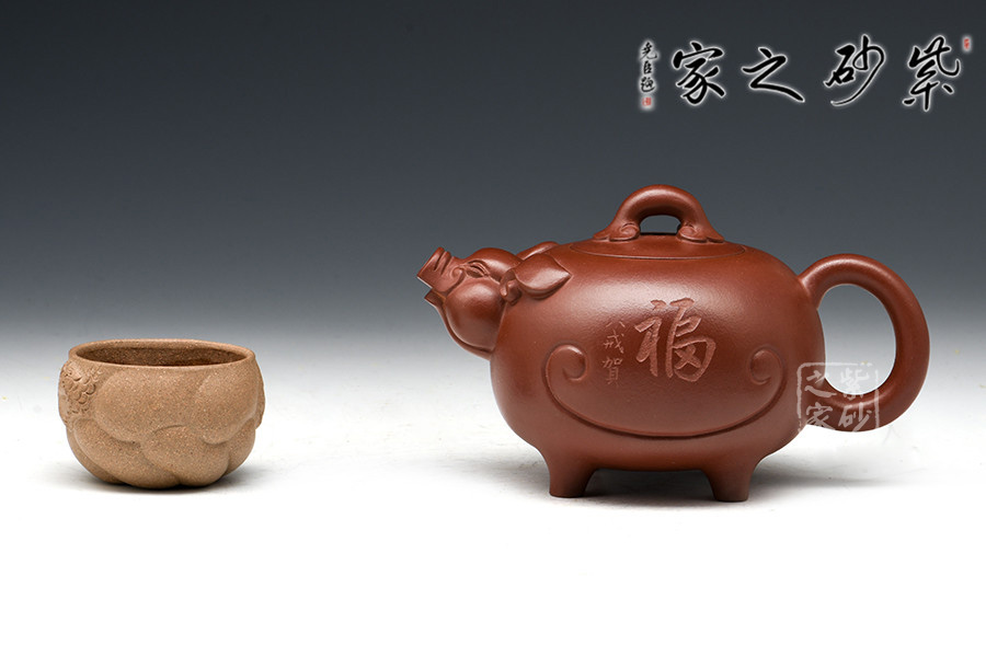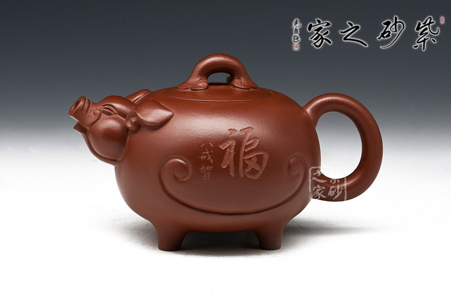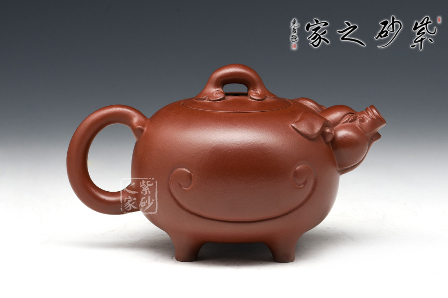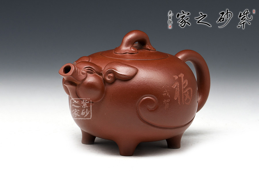 此作整體圓潤非常,以一憨胖的豬形設(shè)計。豬頭作鈕,尾巴為把,四小蹄作壺足,整體豐滿喜慶,十足可愛。