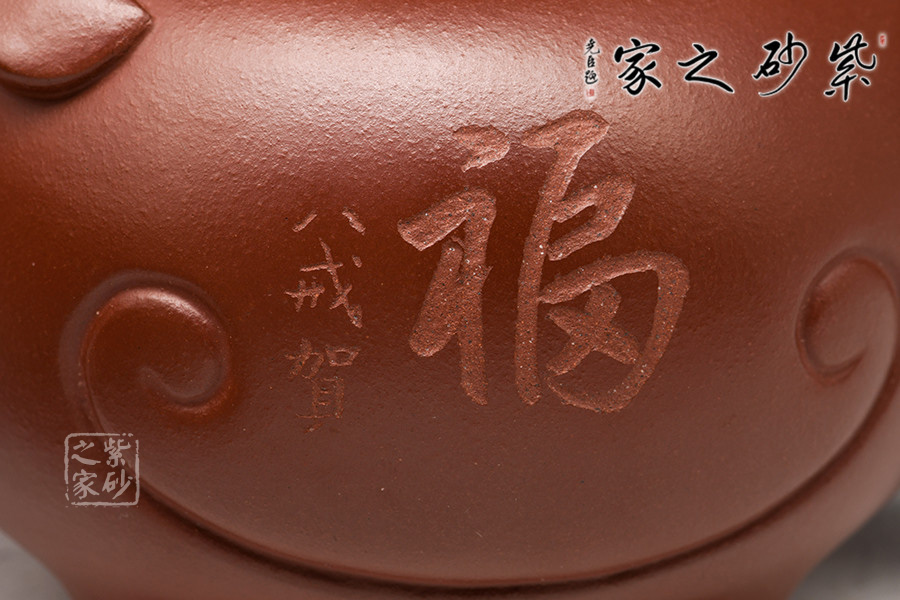還有壺鈕、壺身處飾以如意花紋,刻有一“?!?,“八戒賀”,與動畫形象結(jié)合,更顯得生動有趣,惹人發(fā)笑,人見人愛。