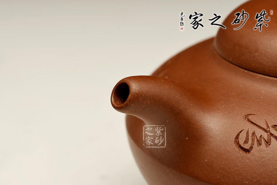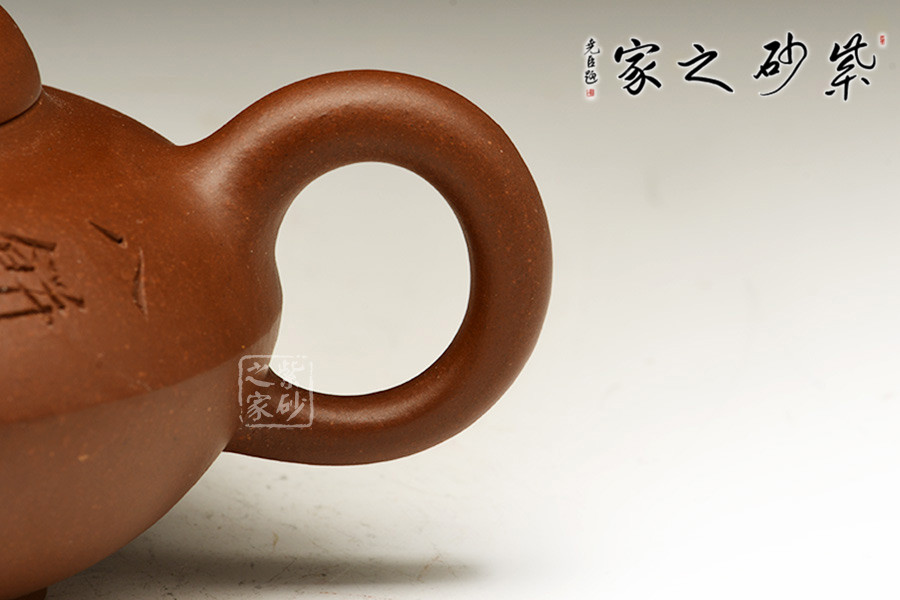 壺蓋隆起,壺鈕大小與壺體切合,看似簡單,實則最難,點睛提神,統(tǒng)括全身。圈足與壺身和諧暗結(jié),壺把略顯松弛,兩端與壺體相接,壺嘴短樸略粗壯,淳樸味道盡顯。 泥質(zhì)沙粒隱現(xiàn),潤澤自然,作工老到,細致處分毫不差。