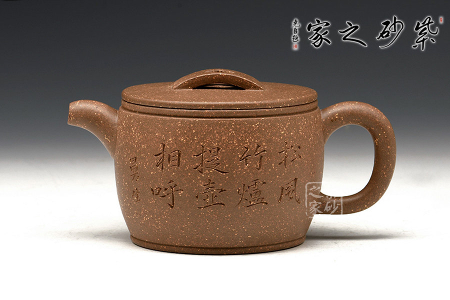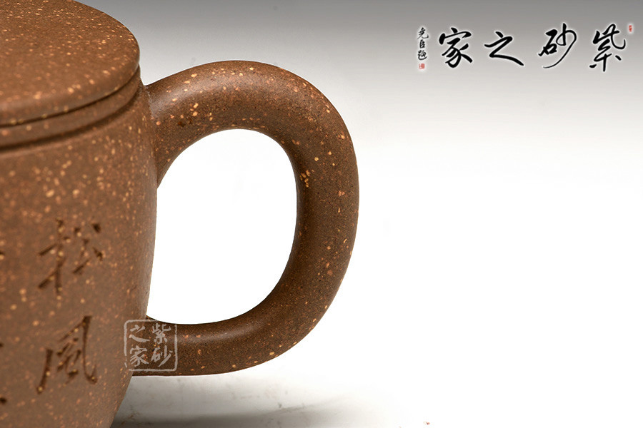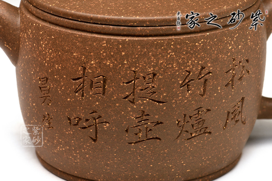 圓筒形壺體,上侈下教,短流勢(shì)微彎向下。蓋平略見弧,橋式鈕,鈕面陰刻海棠紋樣。泥質(zhì)堅(jiān)結(jié),砂色暗黃。壺蓋子口制作圓而不規(guī),轉(zhuǎn)捻即緊,拈鈕可以翕起全壺。