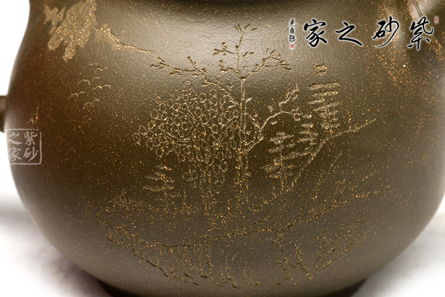 B面: 裝飾: 山林之景 裝飾者:陶刻藝人 裝飾內(nèi)容: 遠(yuǎn)去的雁飛,近處的林郁,一枝一葉一飛形,意境深遠(yuǎn)。