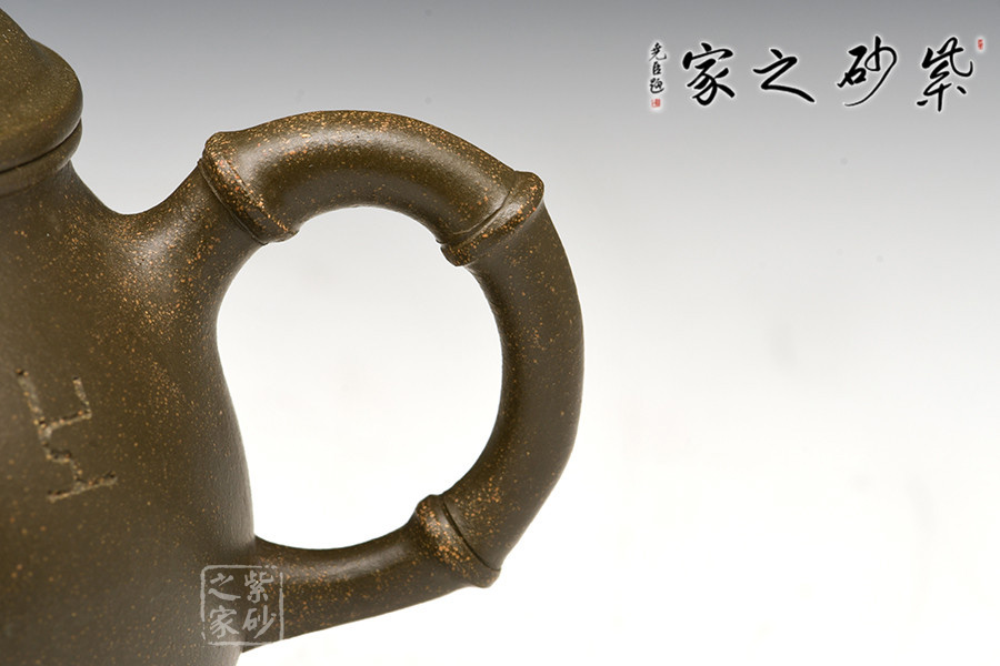 佛肚竹又稱羅漢竹,此壺取形佛肚竹,造型逼真有趣。此作壺身圓潤,大肚能容,高風(fēng)亮節(jié)之質(zhì)。嘴、鈕、把取自竹形,彎繞自然,剛勁挺拔,四時(shí)常青又自然入畫之美。