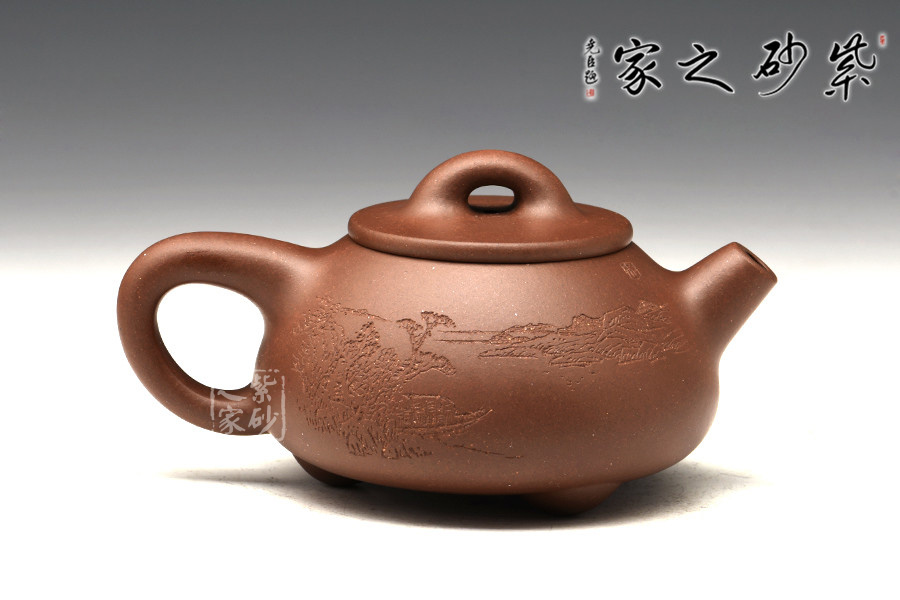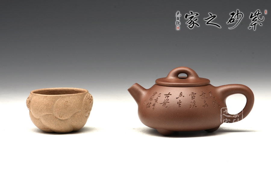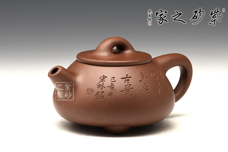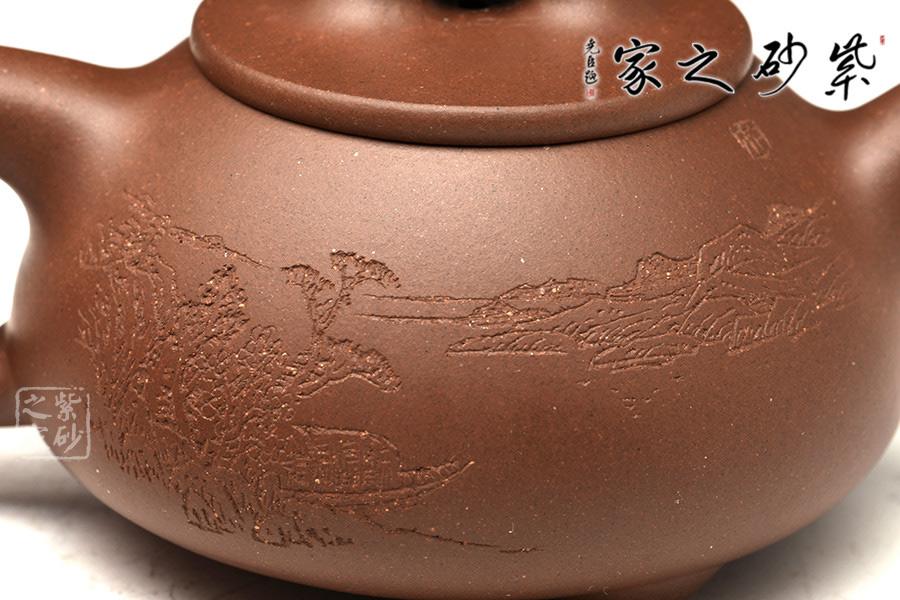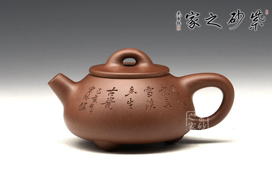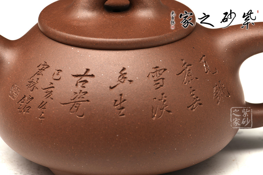 光貨離不開裝飾。俗話說“壺隨字貴,字隨壺傳”:光壺不刻字,就是一把光壺;壺上面刻了大師、名人的字,一把壺的含金量就高了,收藏價值就更高,升值潛力就更大。王福君與中國工藝美術(shù)大師譚泉海合作最多,其次是徐安碧、鮑志強(qiáng)、毛國強(qiáng)(均為中國工藝美術(shù)大師、中國陶瓷藝術(shù)大師)。