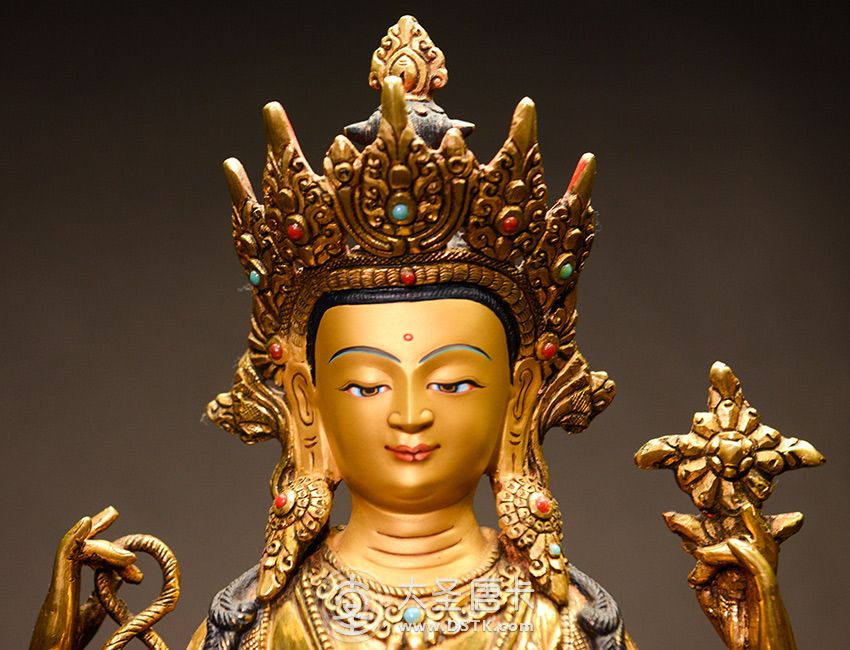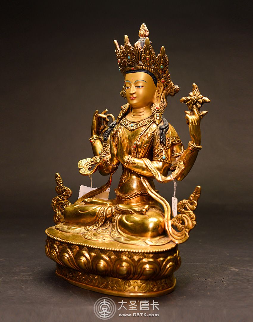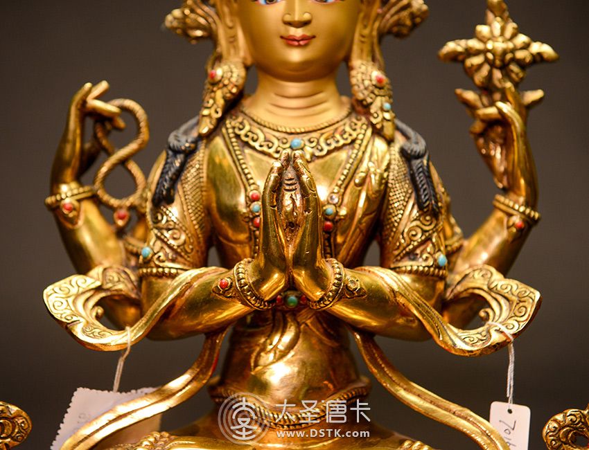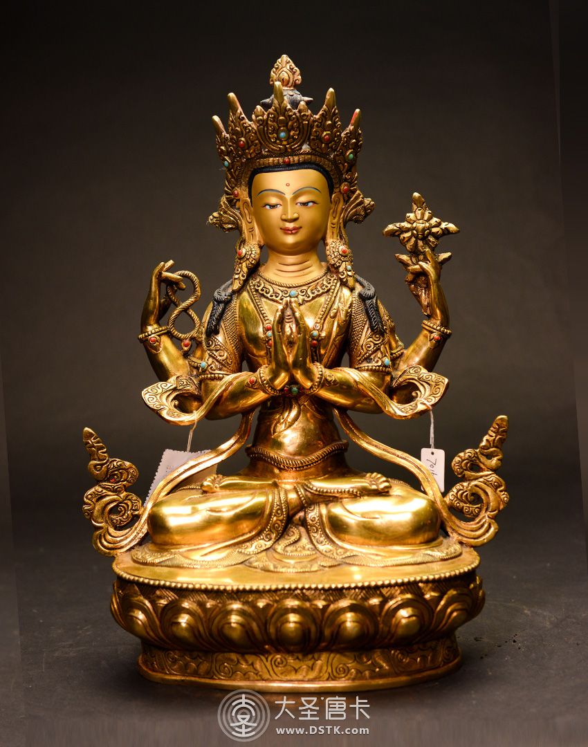 四臂觀音,雪域西藏的守護神,為西藏佛教密宗本尊之一。本尊身顏潔白如月,頭戴五佛冠,發黑色結髻,中央二手合掌於胸前,捧有摩尼寶珠,右手持水晶念珠。左手拈八瓣蓮花與耳際齊,面貌寂靜含笑。