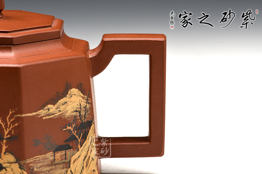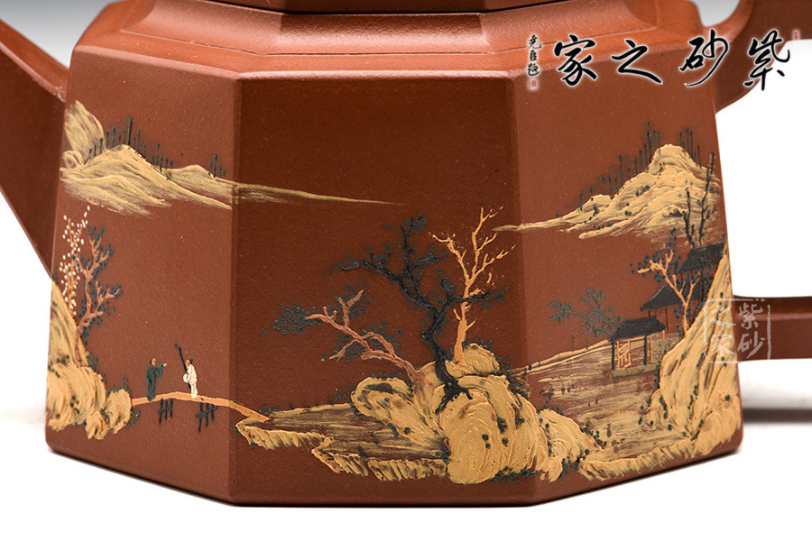 A面: 裝飾: 山水泥繪 裝飾者:陶藝藝人 裝飾內(nèi)容: 遠(yuǎn)山近水,綠樹閑人,布局精妙,善于留白。觀壺賞遠(yuǎn)景,仿似畫中人。