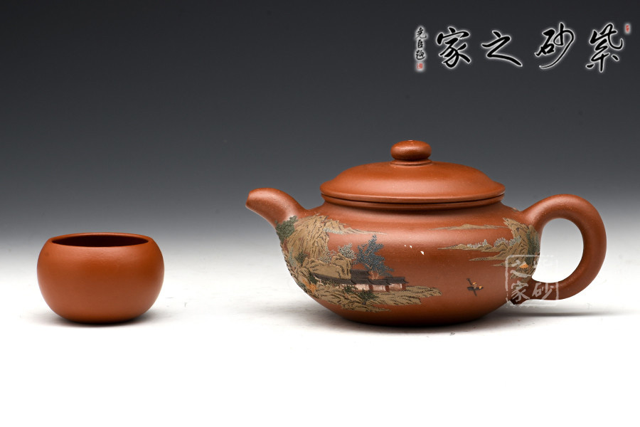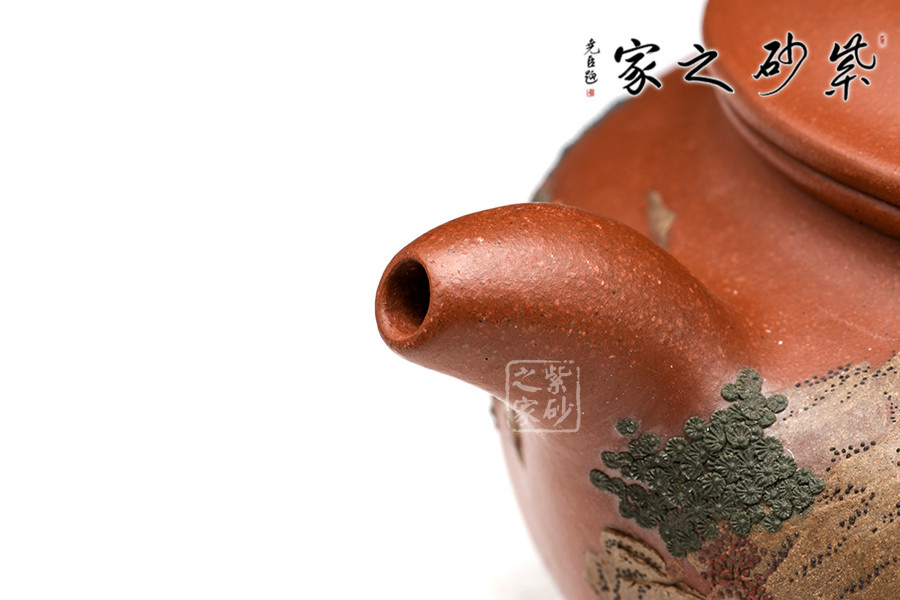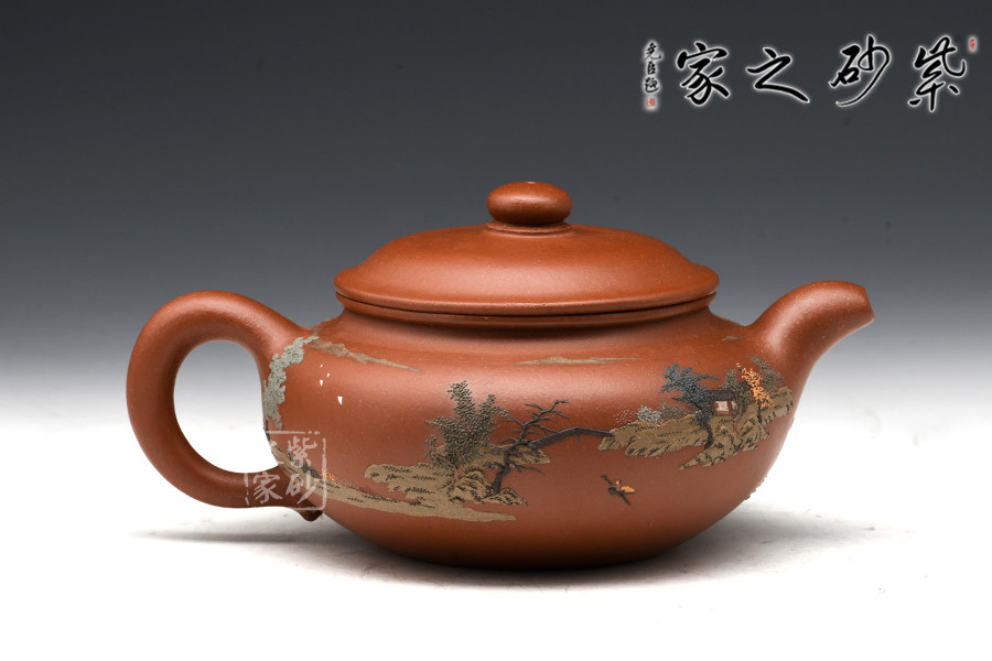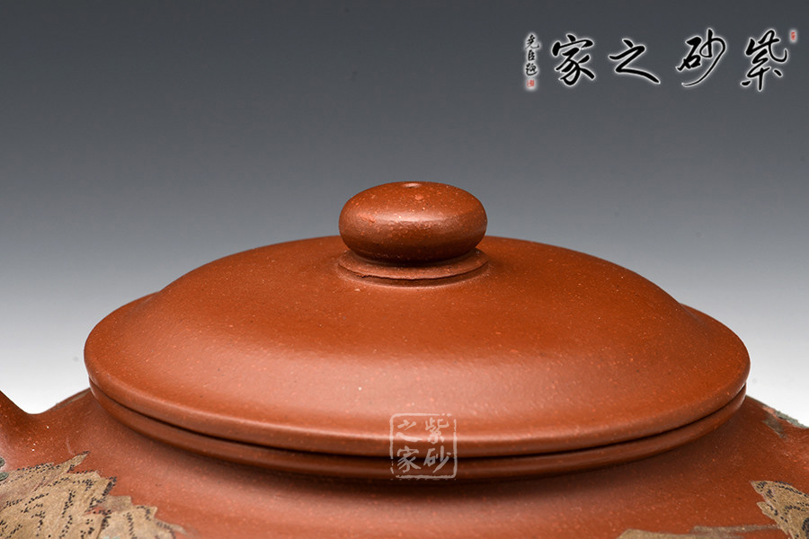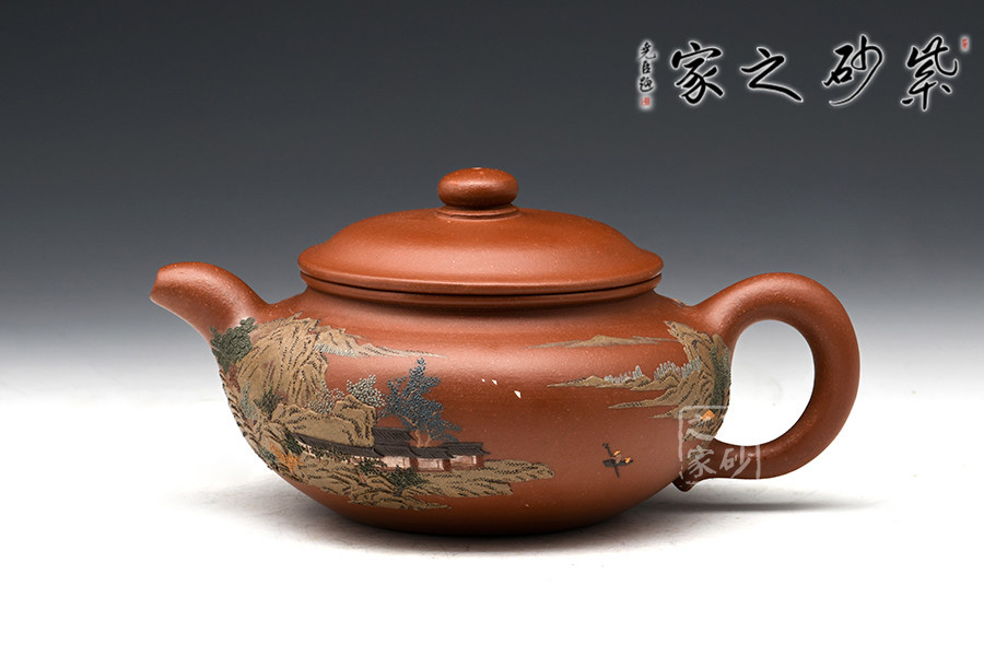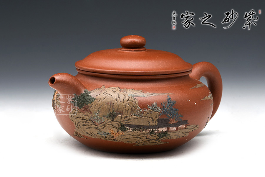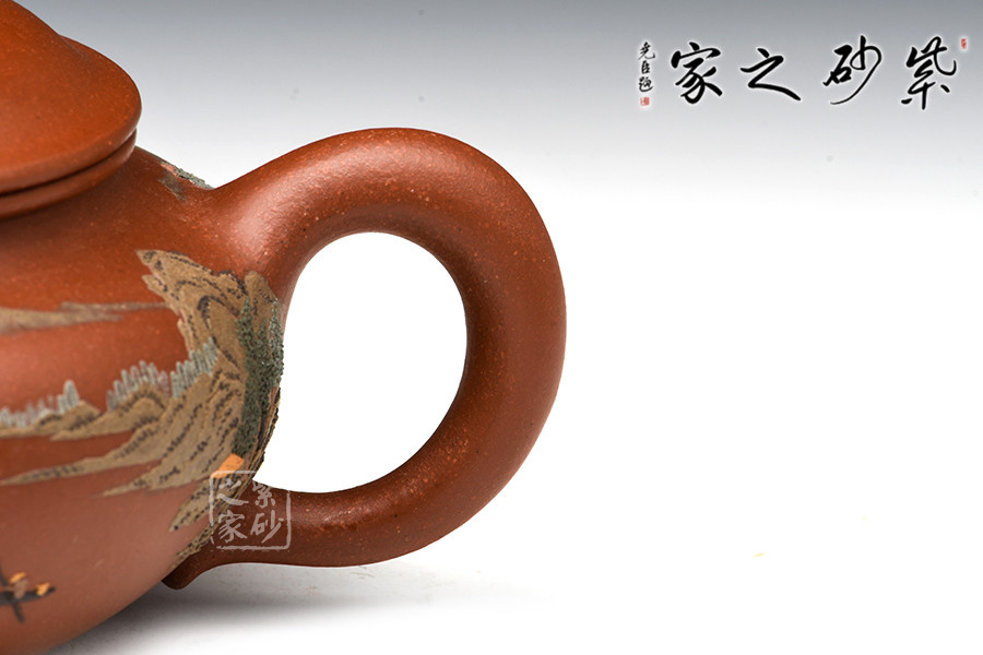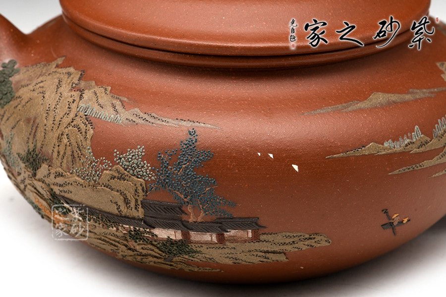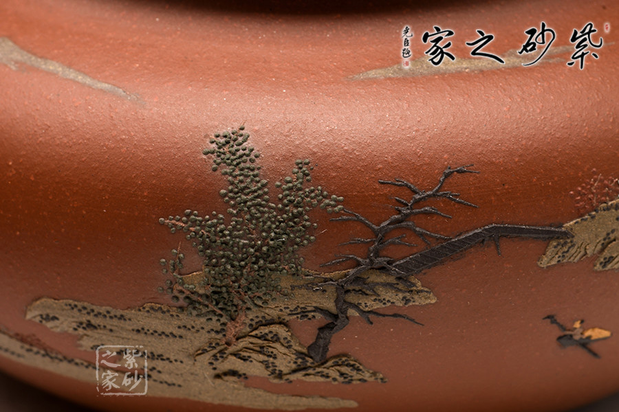 通體裝飾: 裝飾: 泥繪山水 裝飾者: 鮑剛明 裝飾內(nèi)容: 遠(yuǎn)處山巒林立,數(shù)座遙岑,聚散之間,一種與世隔絕的暢然之感溢滿心胸。一眼的山,一眼的樹,怡了性情,醉了心扉,世間俗人入壺景,怎忍離去?