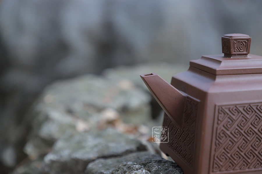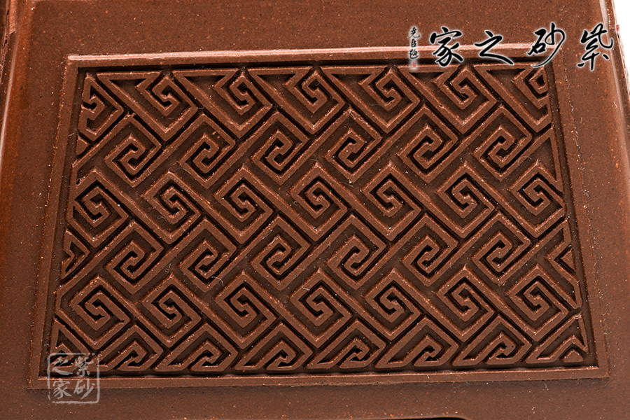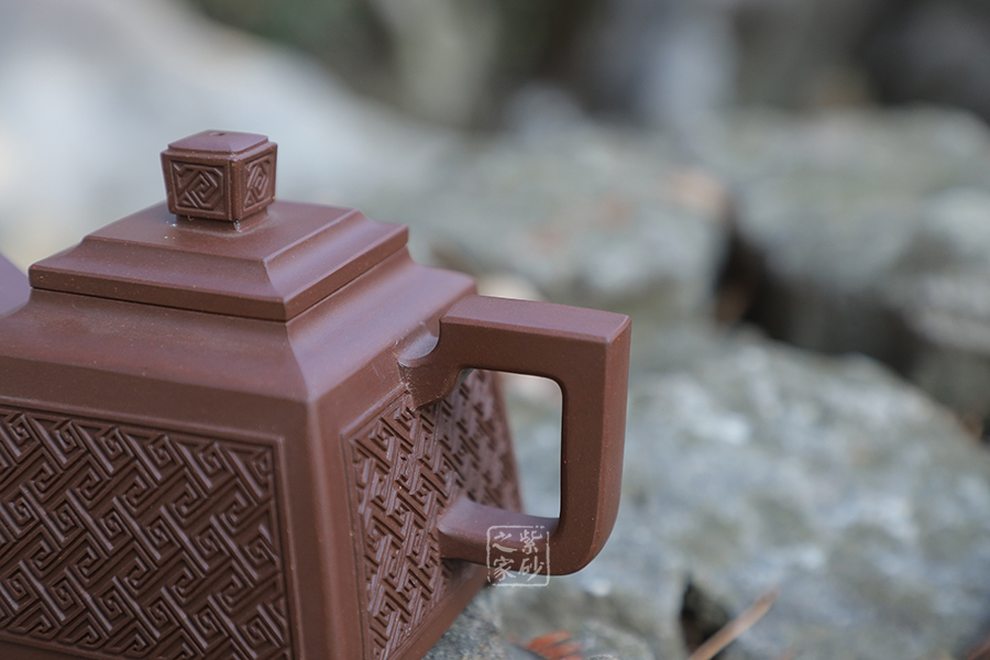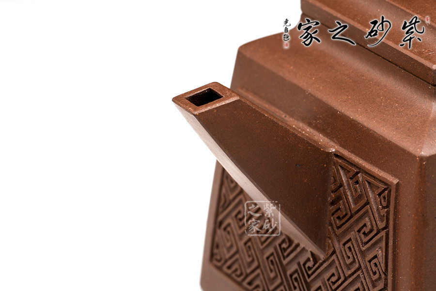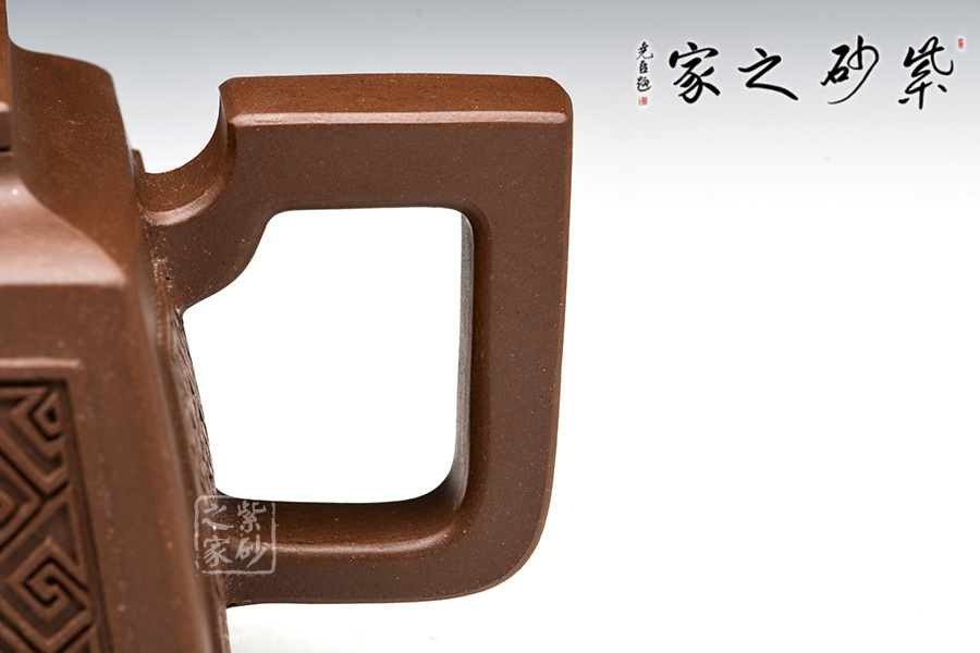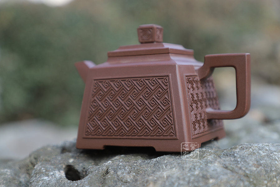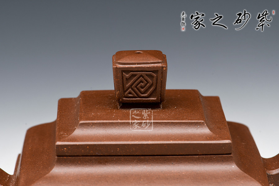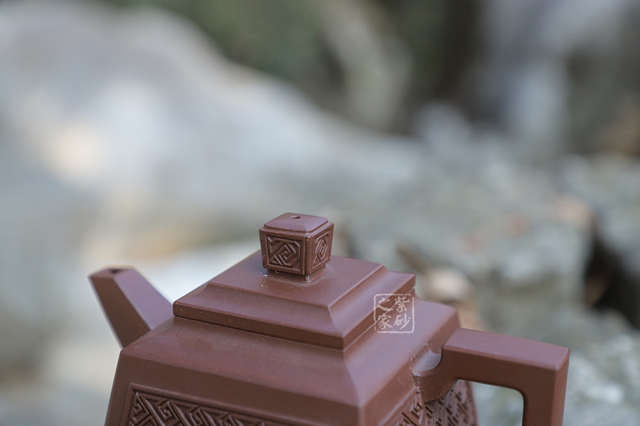 壺型:貴方壺為四方方器,作品形體優(yōu)美,工藝嚴(yán)謹(jǐn),氣韻生動,造型古樸。整體壺行透露出豪爽、剛勁、正直的陽剛之氣;比例準(zhǔn)確,口蓋緊密平整,塊面挺括,線條利落,力度到位。