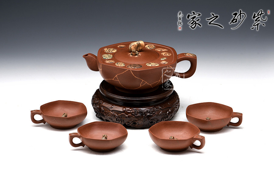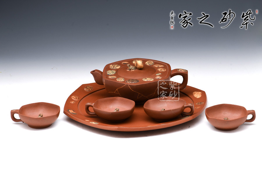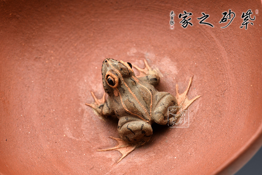 一壺四杯,杯內(nèi)都安置有青蛙形象的裝飾物,細(xì)致的紋路,靈動(dòng)的雙眼,栩栩如生,不管是品茗亦或是觀賞都是一種別樣的享受。