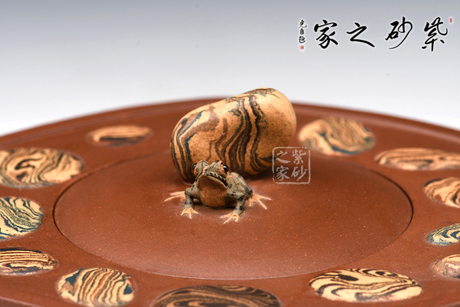 朱紅的花脈為主色,其上四周裝飾著蓮子,仿若粒?;顒?dòng),惟妙惟肖,與壺蓋的青蛙相映襯,層次分明,整體給人以美的享受。整個(gè)壺色彩自然,比例協(xié)調(diào),風(fēng)格淳樸,體現(xiàn)了藝術(shù)源于生活而高于生活的意境。
