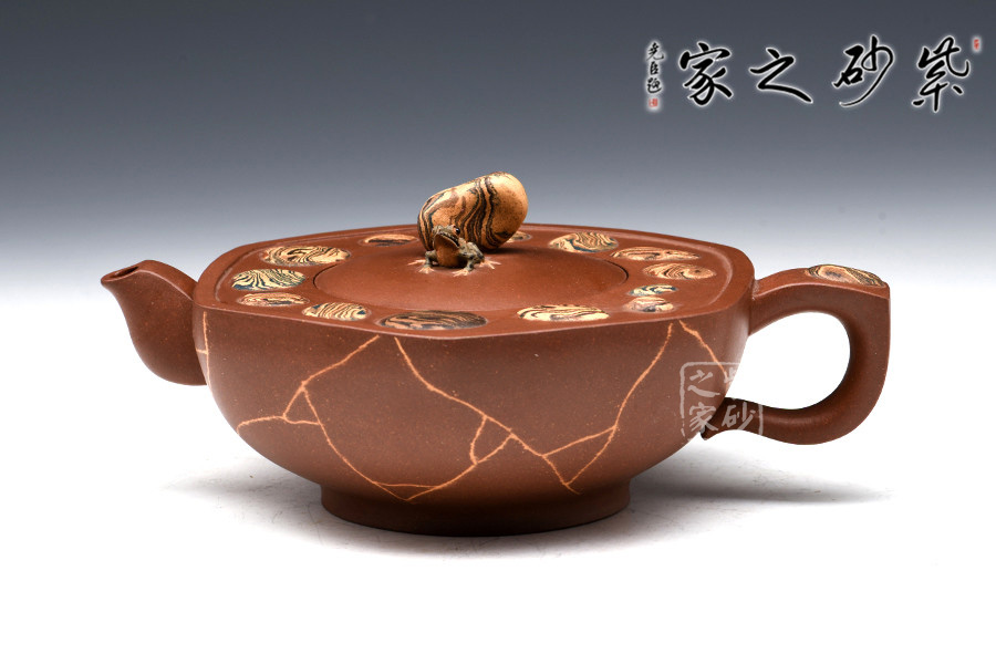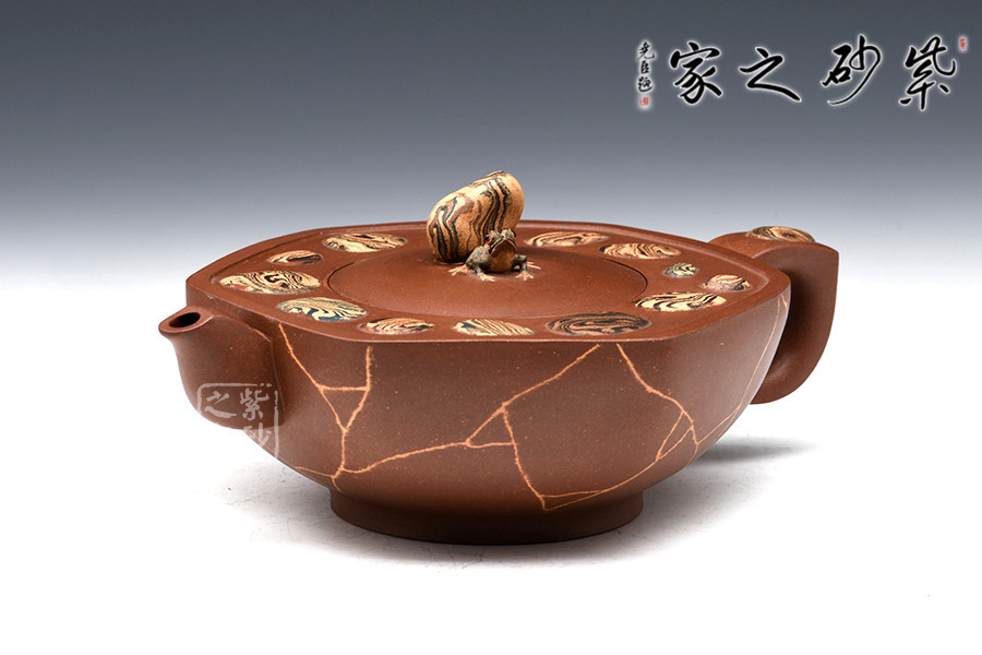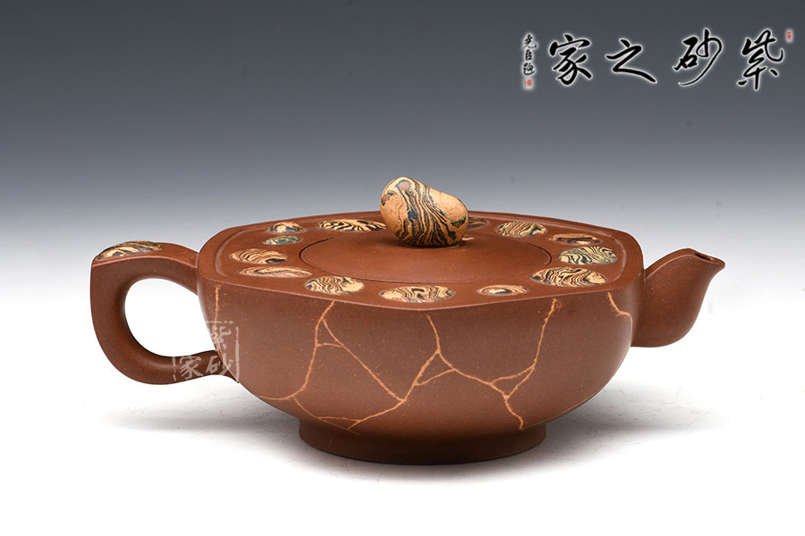 此作還采用了冰裂紋的紫砂裝飾,與溫潤(rùn)的壺身色調(diào)搭配調(diào)和,相得益彰。
