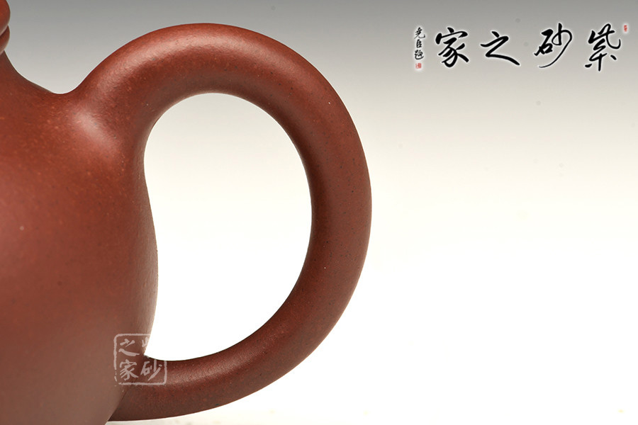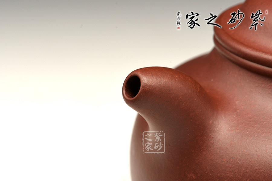 彎流嘴胥出,在端頭下壓,柔美之姿明顯,壺柄略微上抬之后優(yōu)雅滑落而下, 形成一條圓潤(rùn)飽滿(mǎn)的弧線(xiàn),樸雅大方。