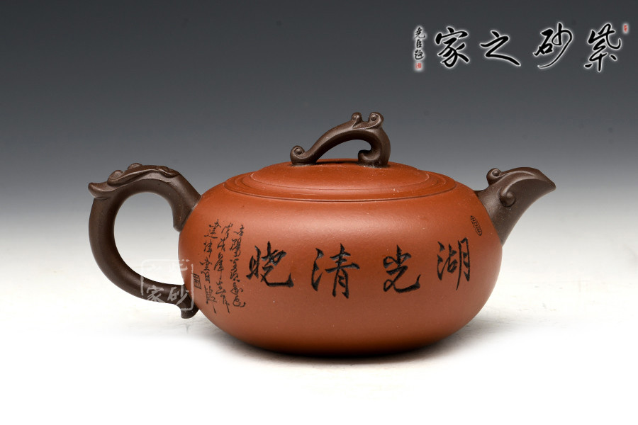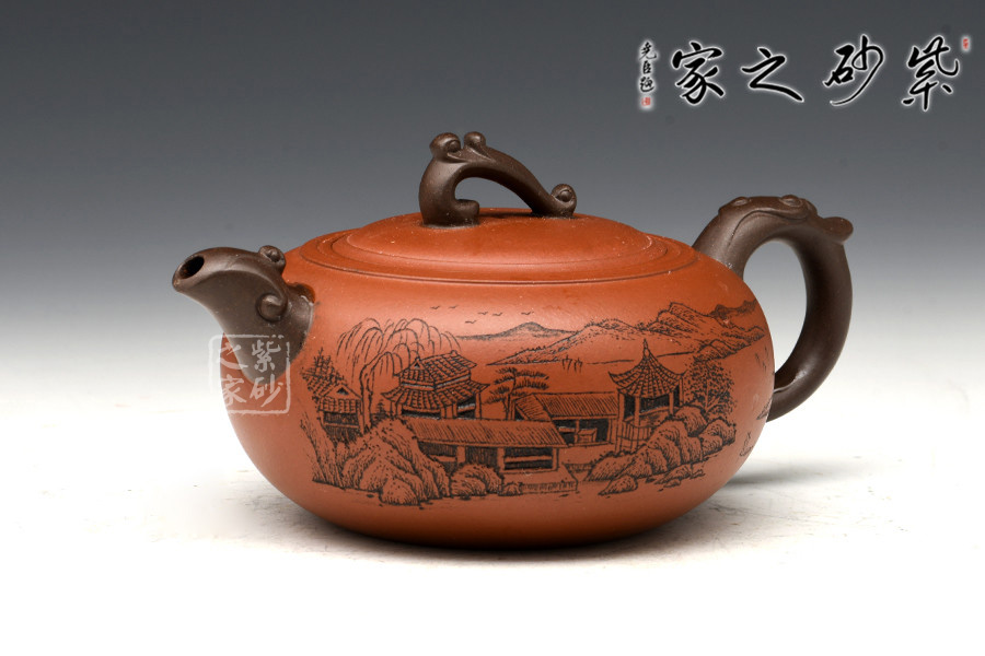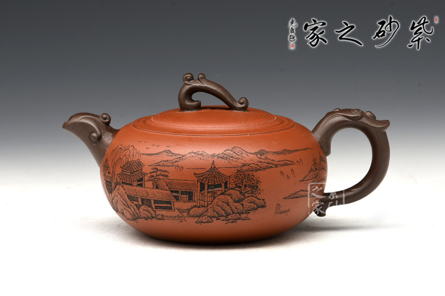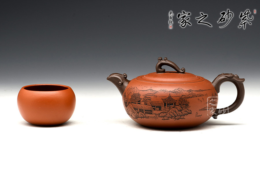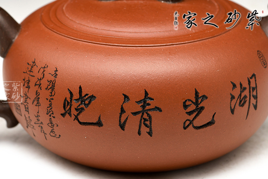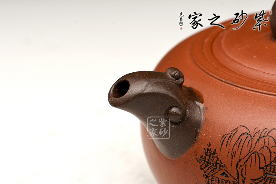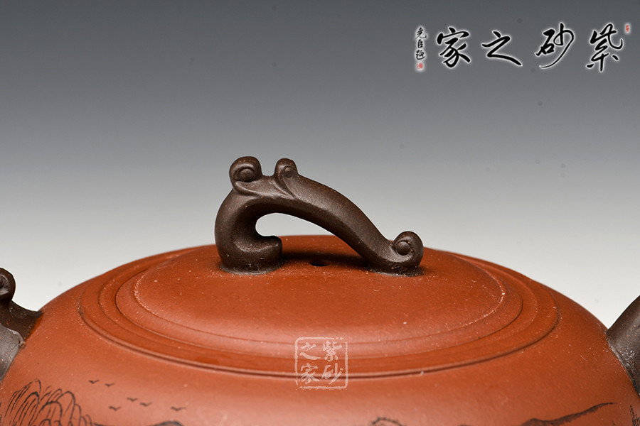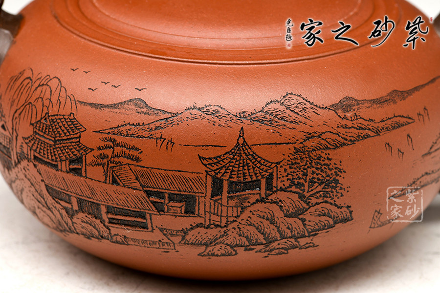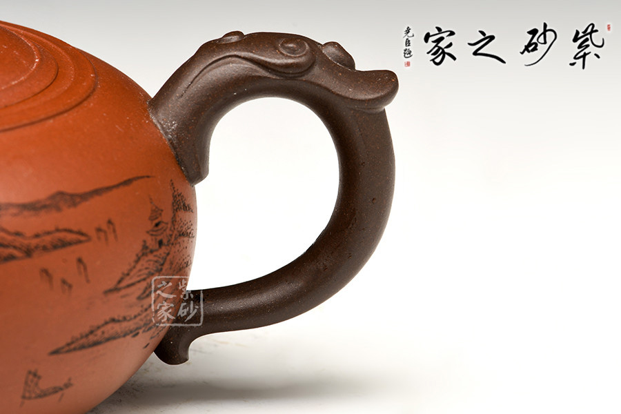該壺刻繪皆由其父朱建偉完成,山水意境美,字體古雅力,藝術(shù)氣息極其濃厚,濃濃的品茗意趣漾然于壺上,令人回味無窮。