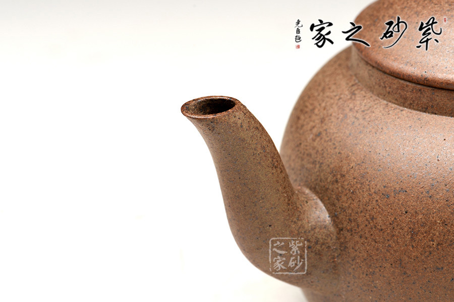 壺型造型簡潔,以其簡練的線條構(gòu)成渾厚的藝術(shù)空間,深厚而有神韻。壺體敦實(shí)圓厚,三彎流壺嘴,出水通暢,耳形把形美有動感。