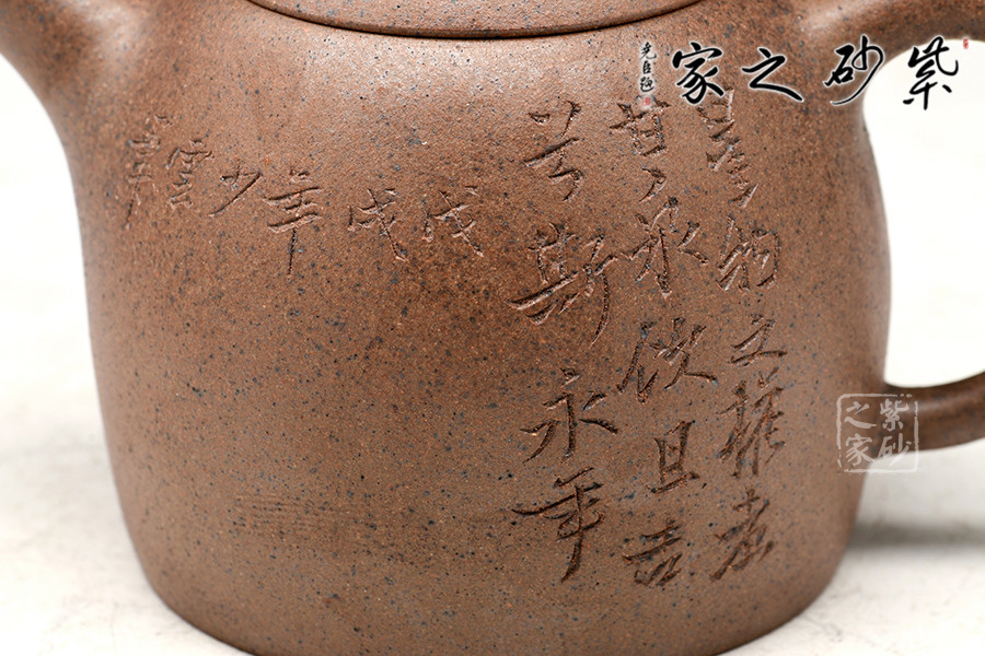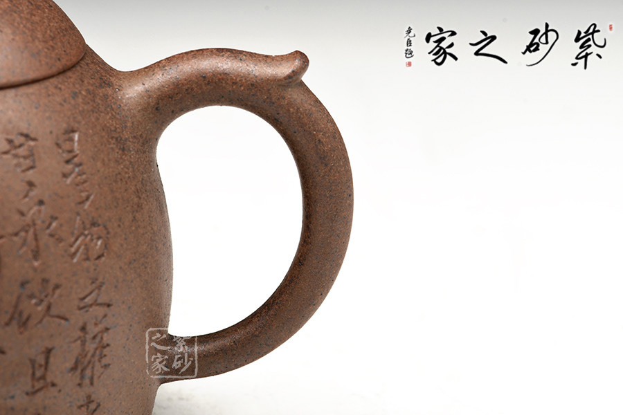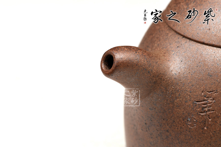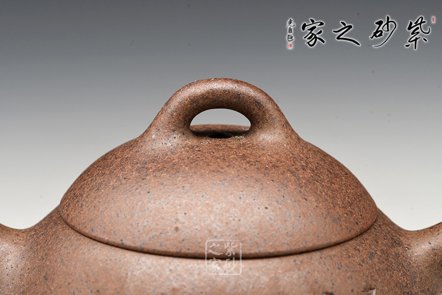壺身挺拔由下至上收斂,天然流通;流短有勁,環(huán)耳形把手,不矯不揚(yáng);截蓋微鼓,沿與蓋品天衣無(wú)縫;鈕似橋頂,壺形全體簡(jiǎn)練,古拙,大方。