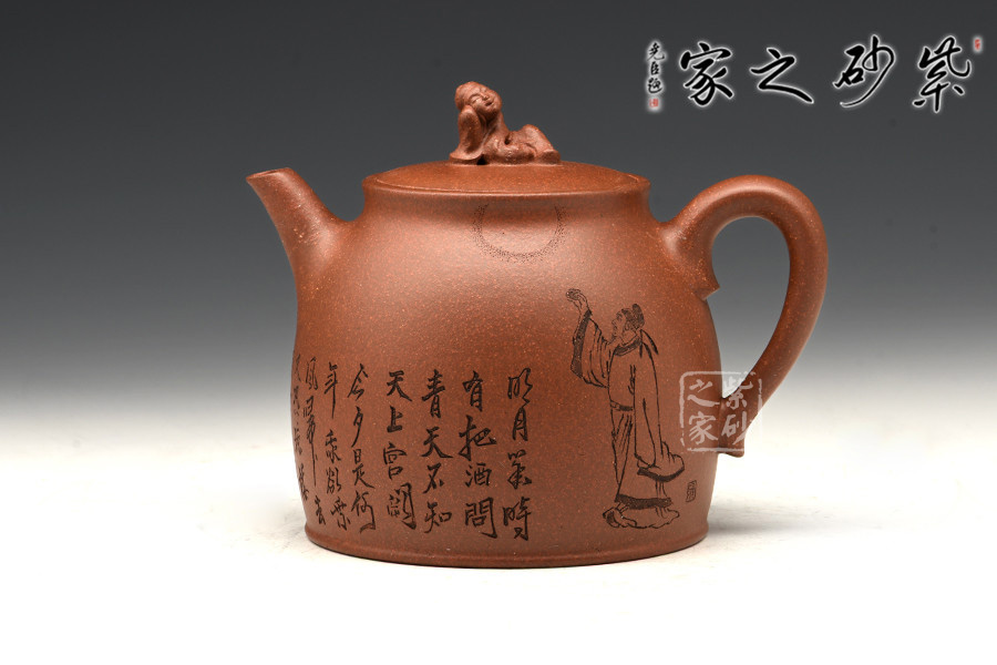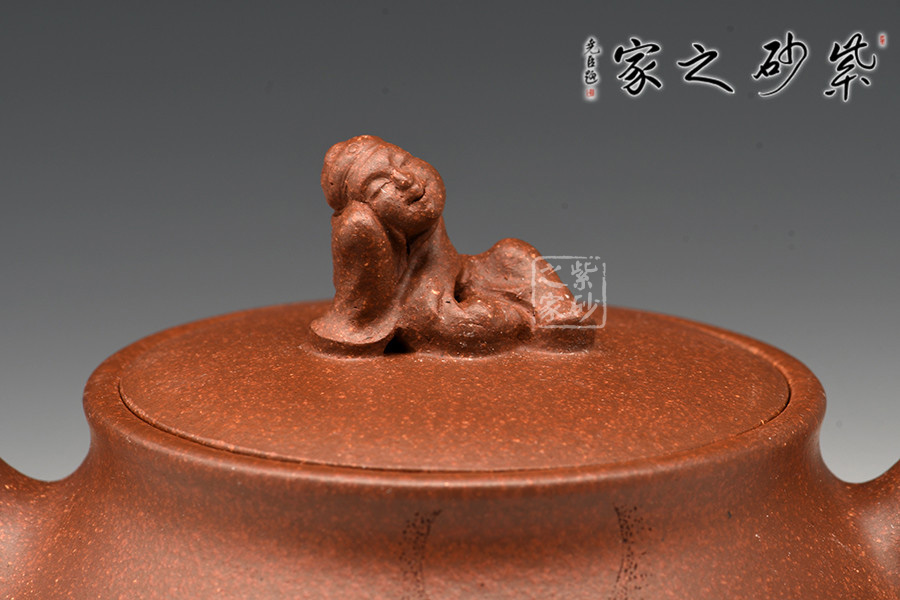 亮點之處在于其鈕,以一側(cè)臥賞月的小人為形,看似簡單的人物雕刻,但整體卻看出來一股滿足、舒閑的意味。與賞月一樣,飲茶品茗所追求的也是身心的愉悅和輕松。