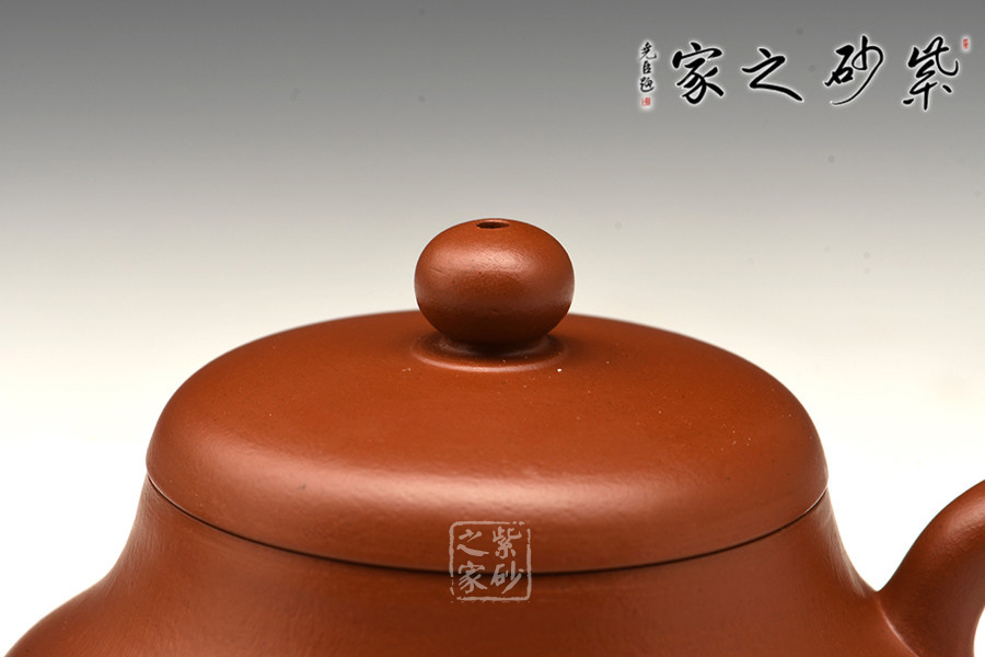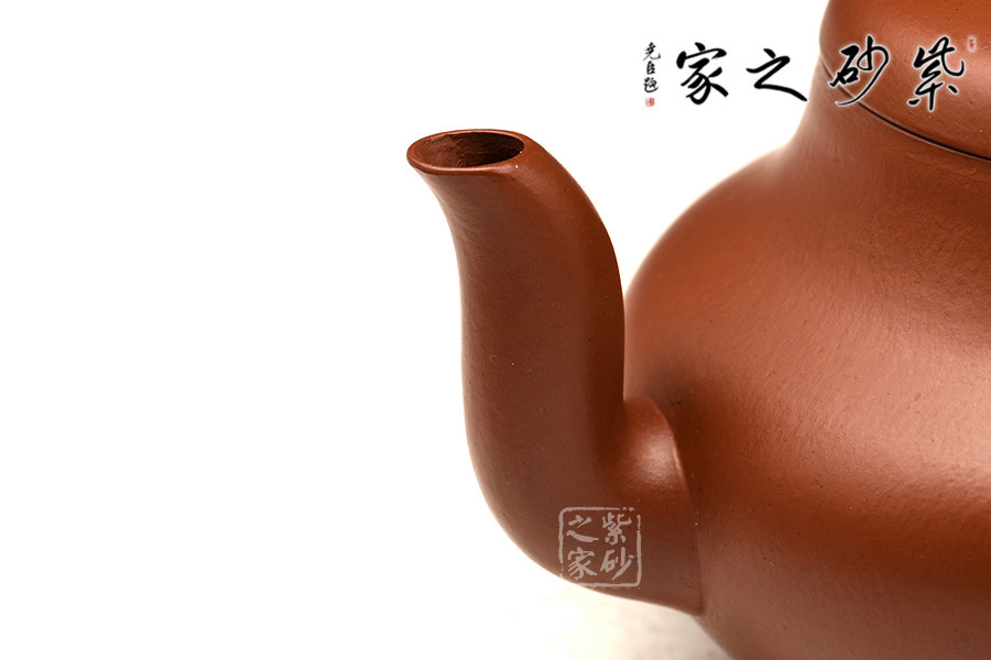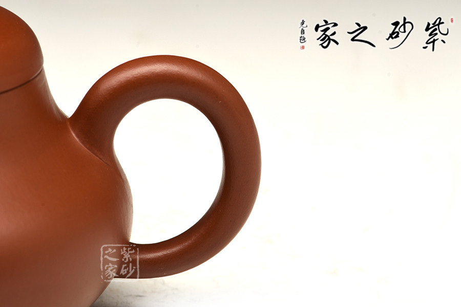 呈鼓腹矮梨形,三彎流朝天,圓環(huán)把,截蓋圓珠鈕。整器簡(jiǎn)樸大度,個(gè)性鮮明,在角線、面的處理上達(dá)到了“均、挺、圓、正”。
