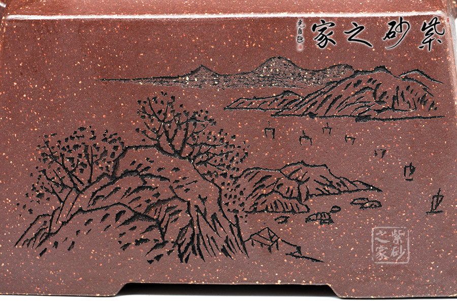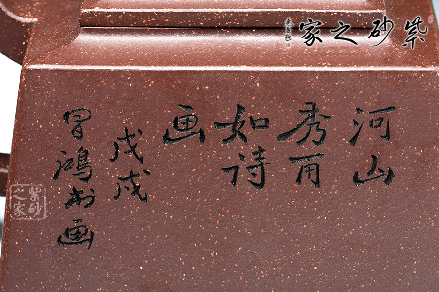 李昌鴻大師于壺身之上刻山水詩詞,表明對(duì)高徒楊瑤芬壺藝的認(rèn)可,同時(shí)“壺隨字貴”,也增加了此壺的收藏價(jià)值。