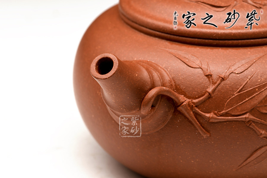 壺嘴的彎度,整體有上升感,竹骨處呈自然彎勢,與壺身呼應(yīng),出水口有流水感。