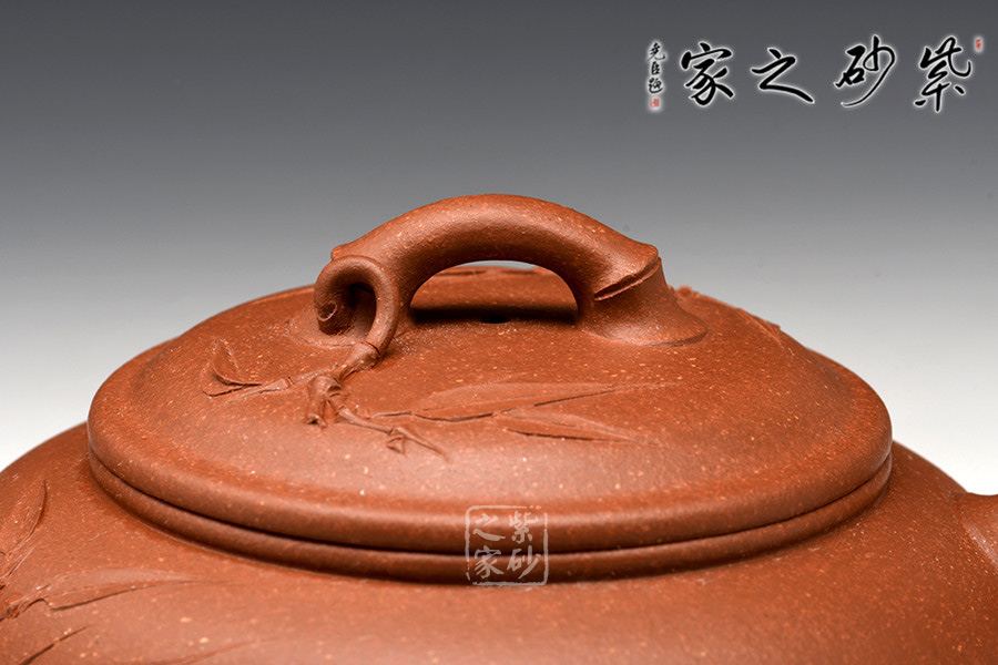 壺鈕增加了上升力度,體現(xiàn)整體上升感度。竹子的彎曲度比例恰到好處,與壺身的竹子上下呼應(yīng)。