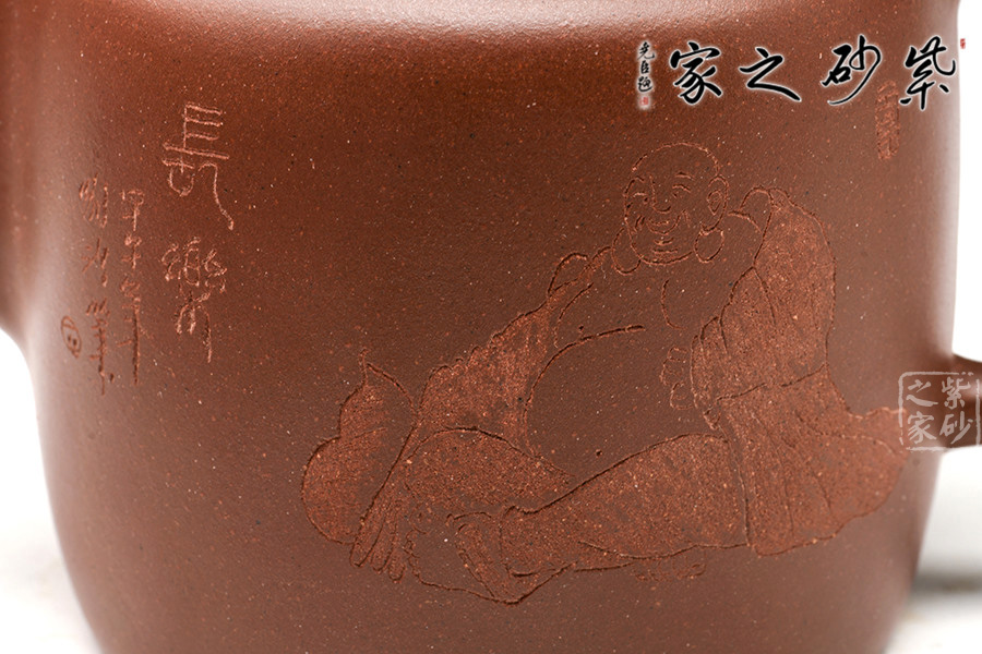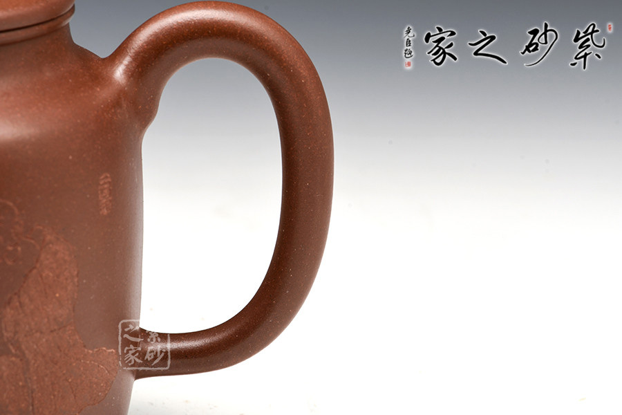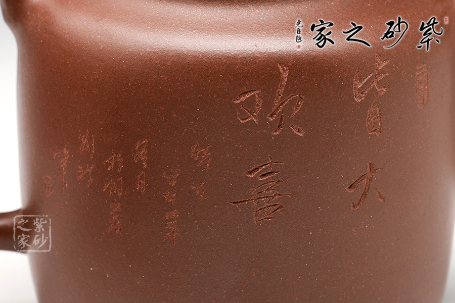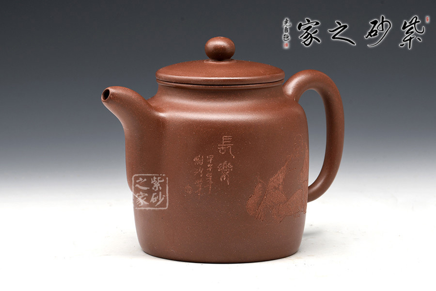 此作線面挺刮,氣度飽滿,肩線、口線、腳線均稱濕潤,口蓋嚴(yán)密無隙,流圓渾有勢,飽滿得體。壺身刻繪刀法清麗,更顯氣韻。