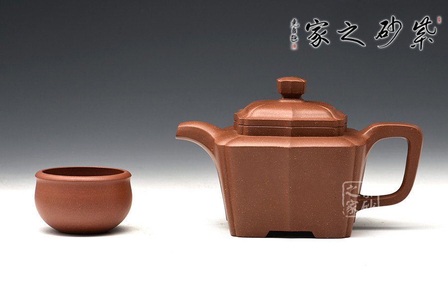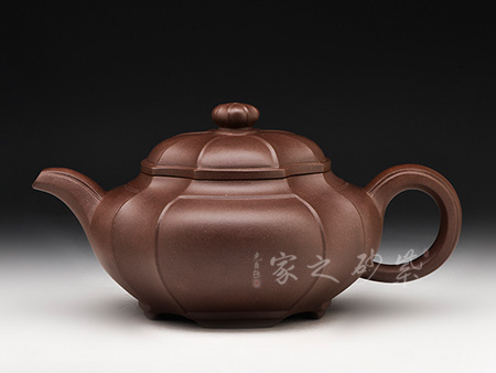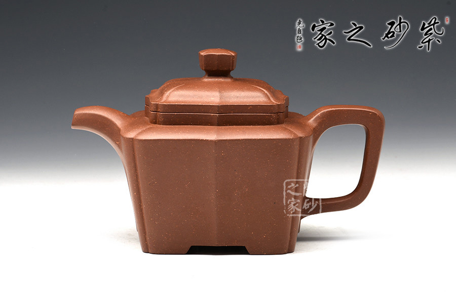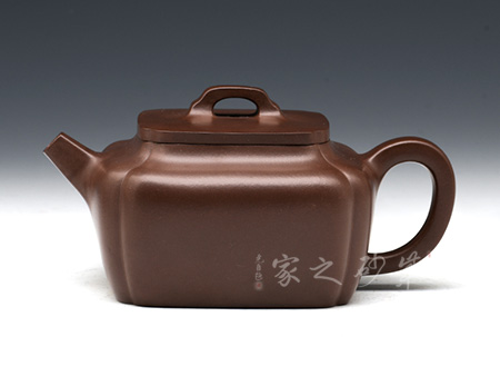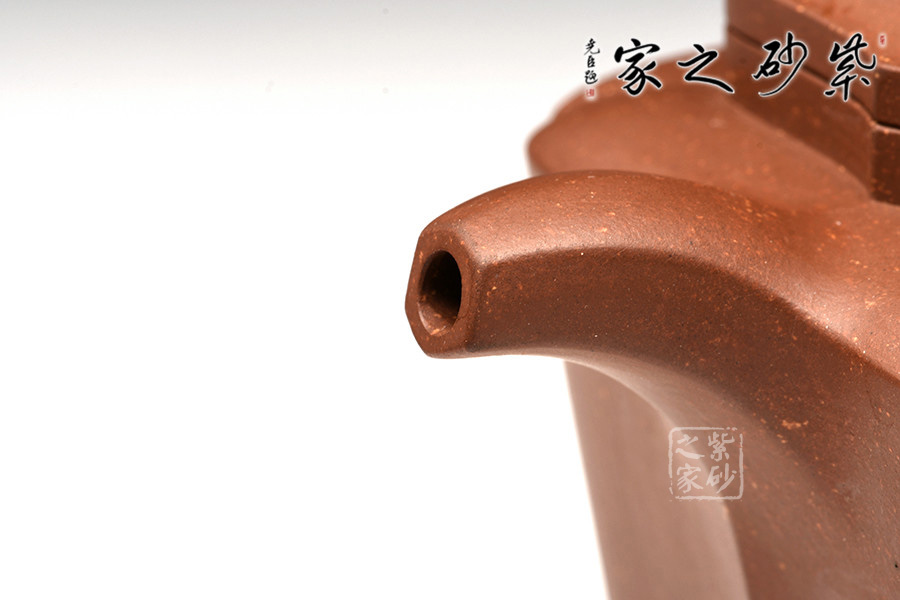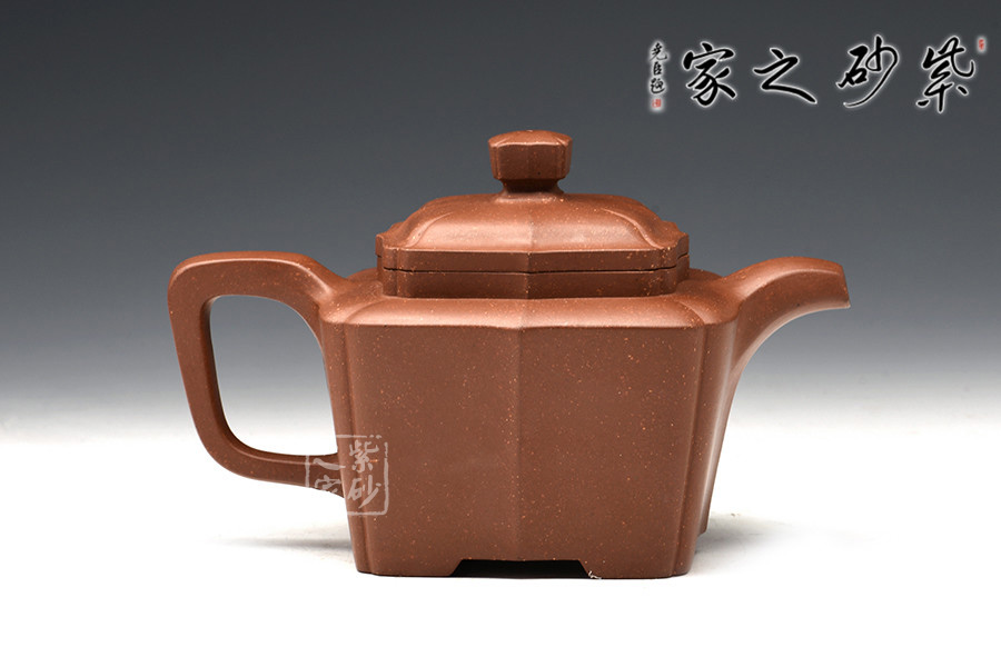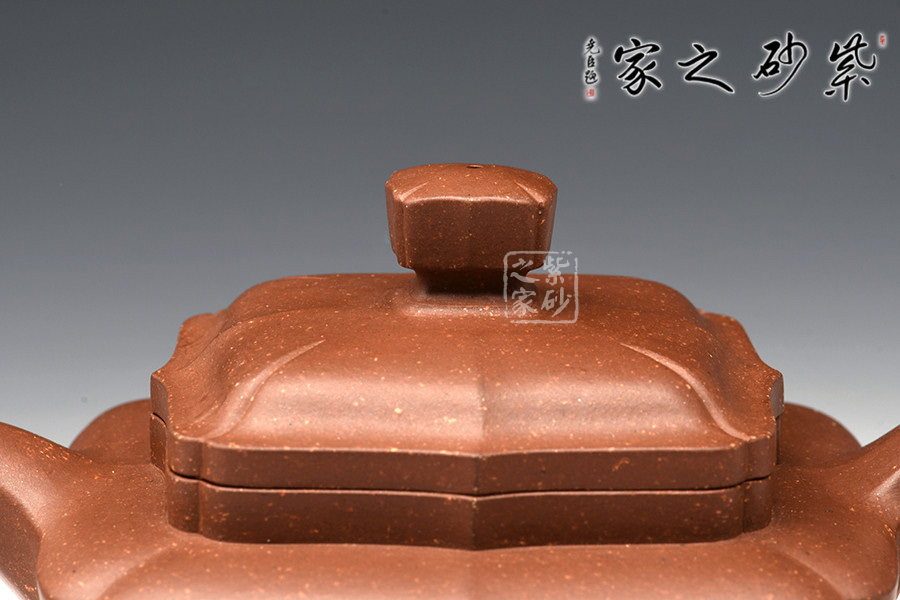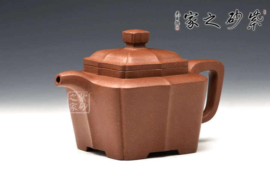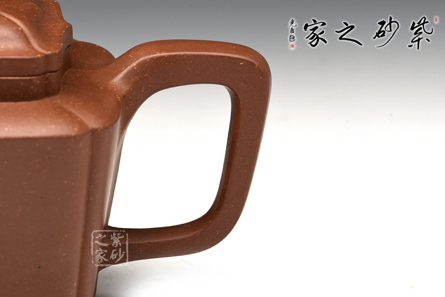 此作造型端莊、做工精細、線面處理得當。由傳統(tǒng)方器為設計理念,在壺體四角以筋紋抽角的形式處理,筋紋抽角貫穿于壺身、壺頸、壺蓋與壺鈕,在美化壺體的同時也增加了此壺的制作難度,但整壺又不失實用性。