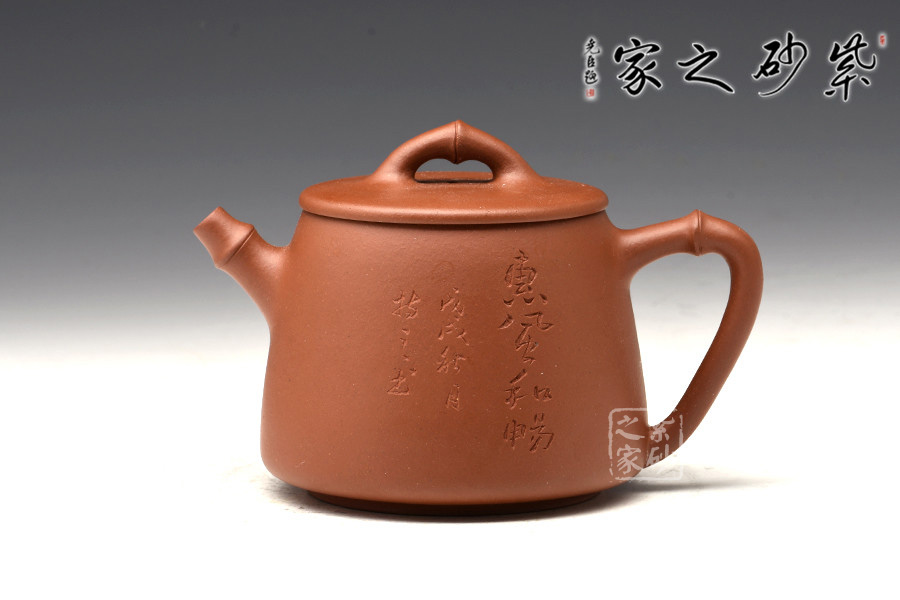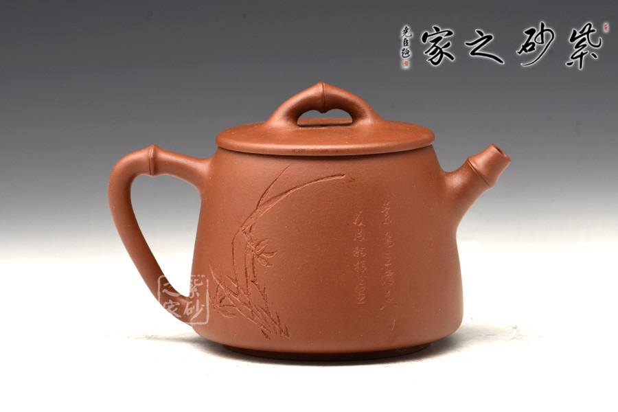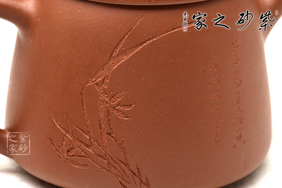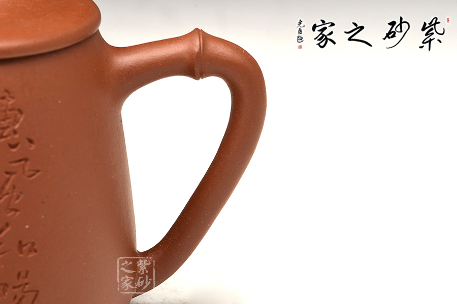 嘴、把、鈕均呈竹形,手工雕刻的竹子形象惟妙惟肖,起落之間的收放自如,完美詮釋了匠人深厚的制壺功底。