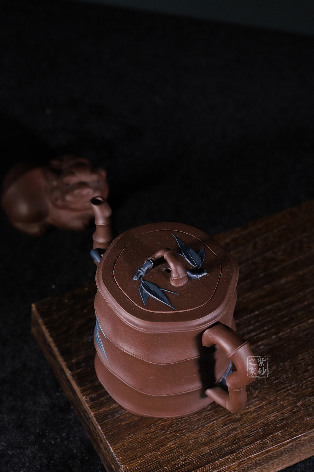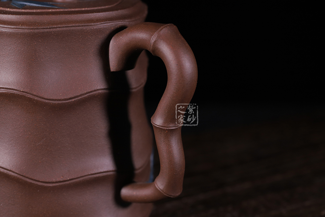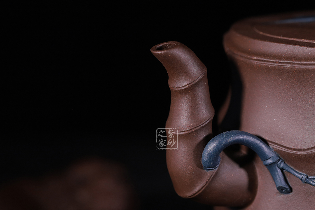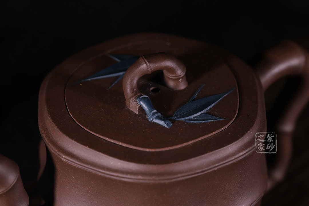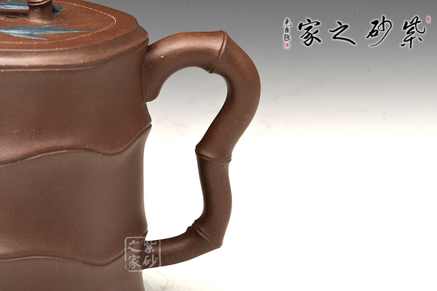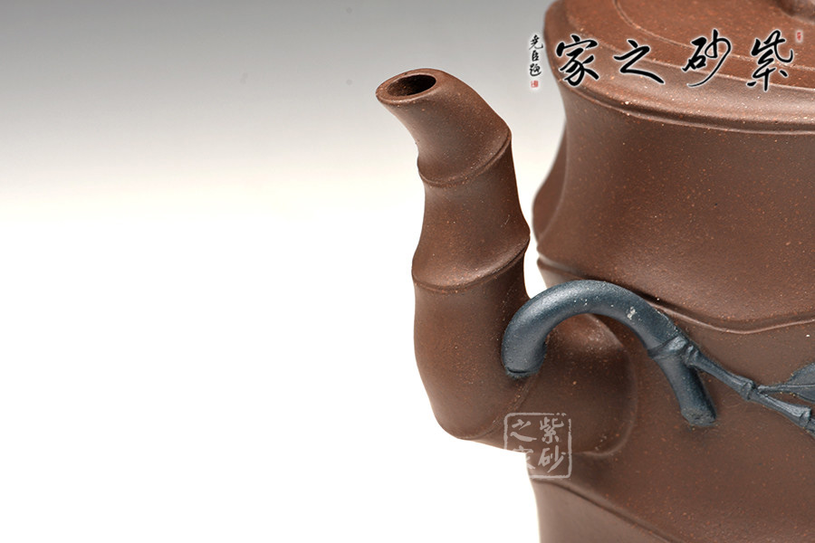 壺身采用竹段造型,壺身直而粗壯,壺嘴、壺鈕、壺把均以竹段造型,清秀自然,挺拔高雅,竹以清高著稱,壺更有雅潔之態(tài)。