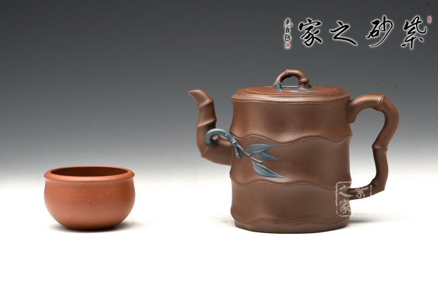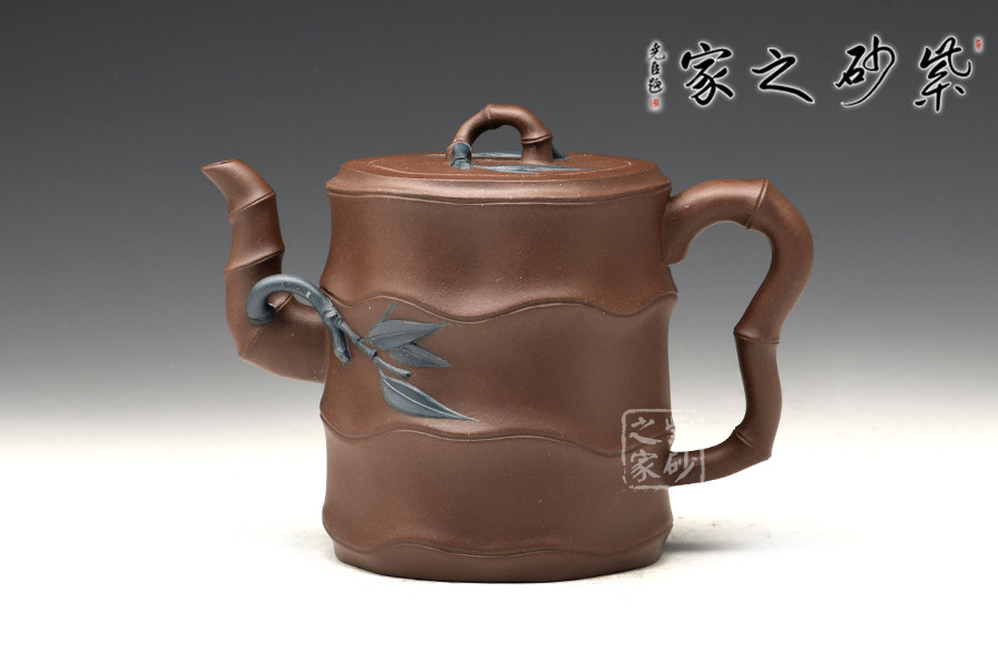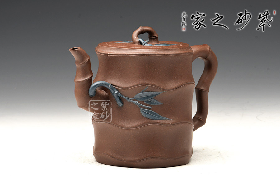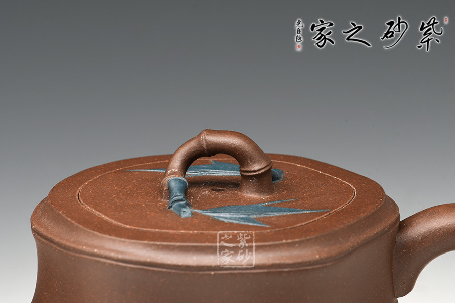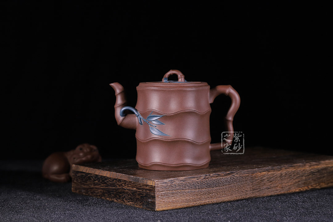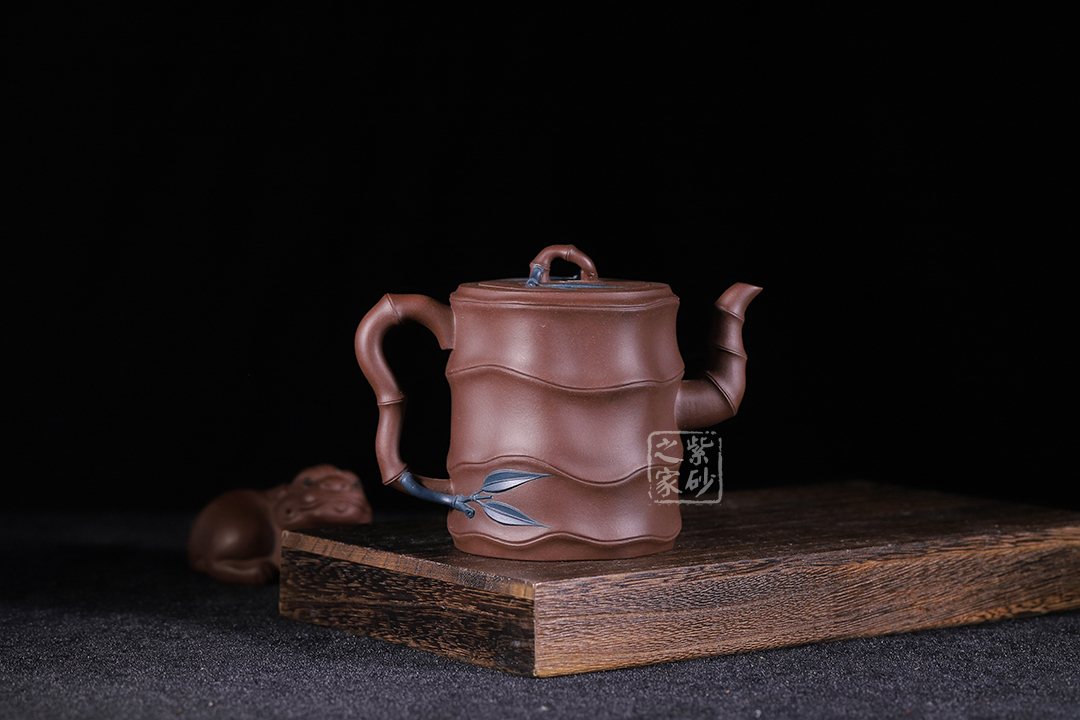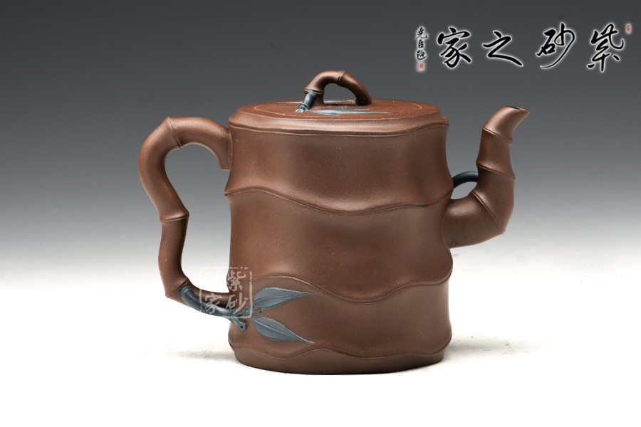 壺身采用竹段造型,壺身直而粗壯,壺嘴、壺鈕、壺把均以竹段造型,清秀自然,挺拔高雅,竹以清高著稱,壺更有雅潔之態(tài)。