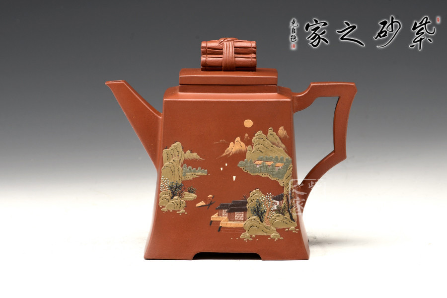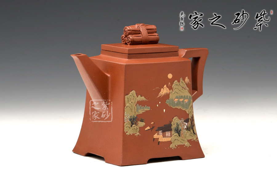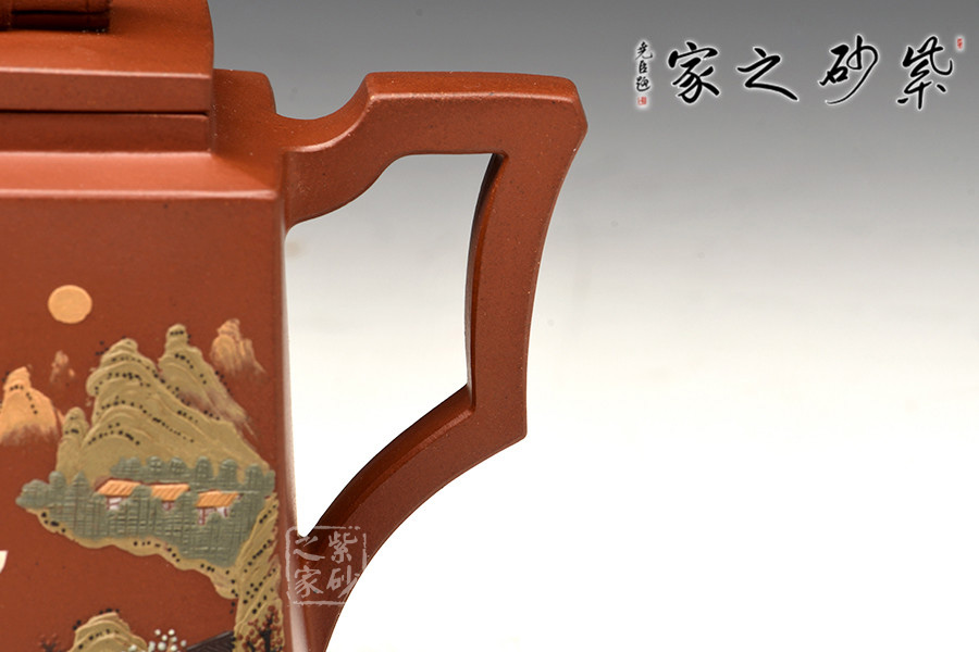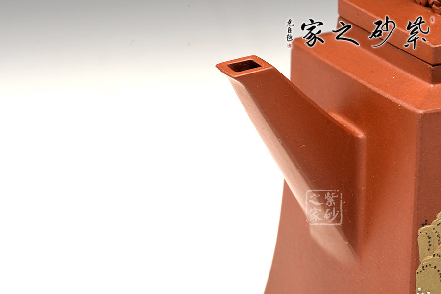 壺身上小下大,壺型修長(zhǎng)穩(wěn)重,線條轉(zhuǎn)變自然,壺體、壺嘴、壺把均為方形,壺把線條有直有曲,拿捏平穩(wěn)又不失趣味。