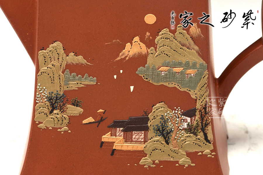 A面: 裝飾: 泥繪山水 裝飾者:馮振亮 裝飾內(nèi)容: 落日余暉,一片小舟,暢游其間,無(wú)限美意!