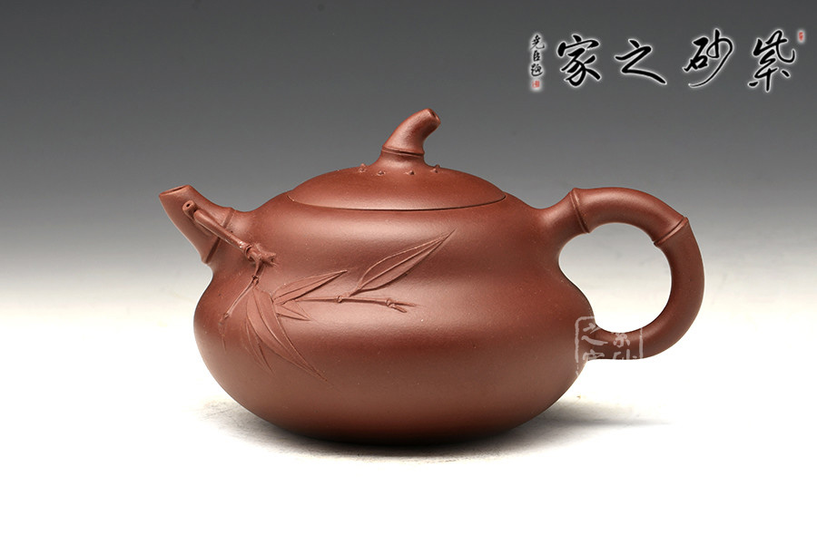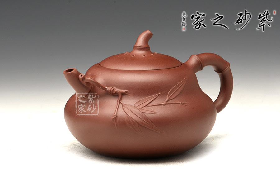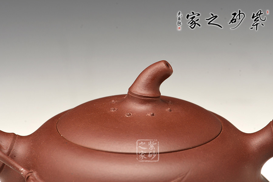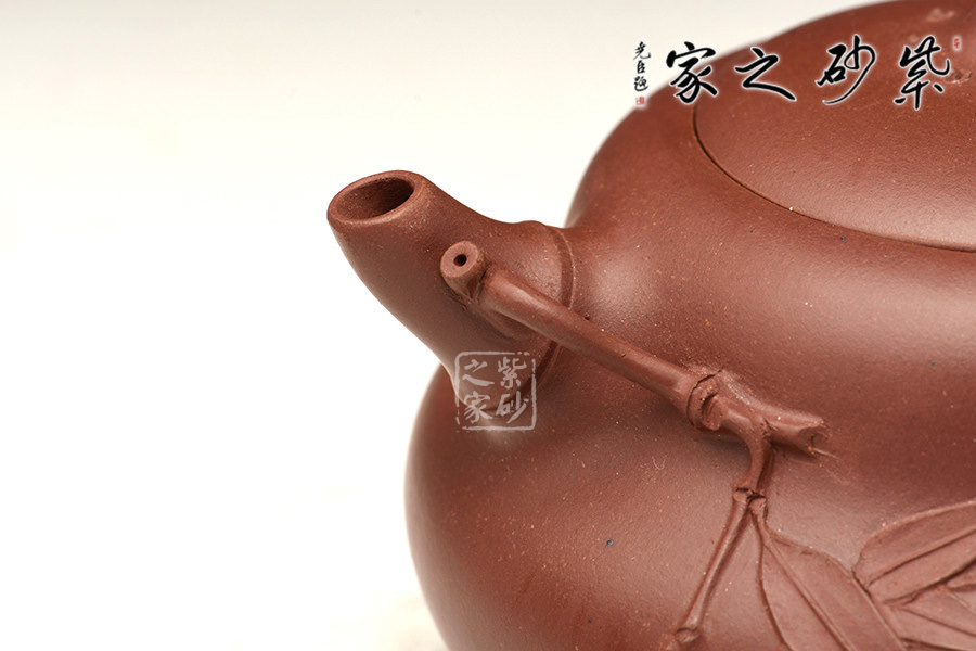 此款壺在曼生葫蘆壺的基礎(chǔ)上加入了竹子元素,嘴、鈕、把均呈現(xiàn)竹節(jié)形狀,彎繞自然有趣,壺身處生出竹葉新枝,觀之欣喜,賞心悅目。