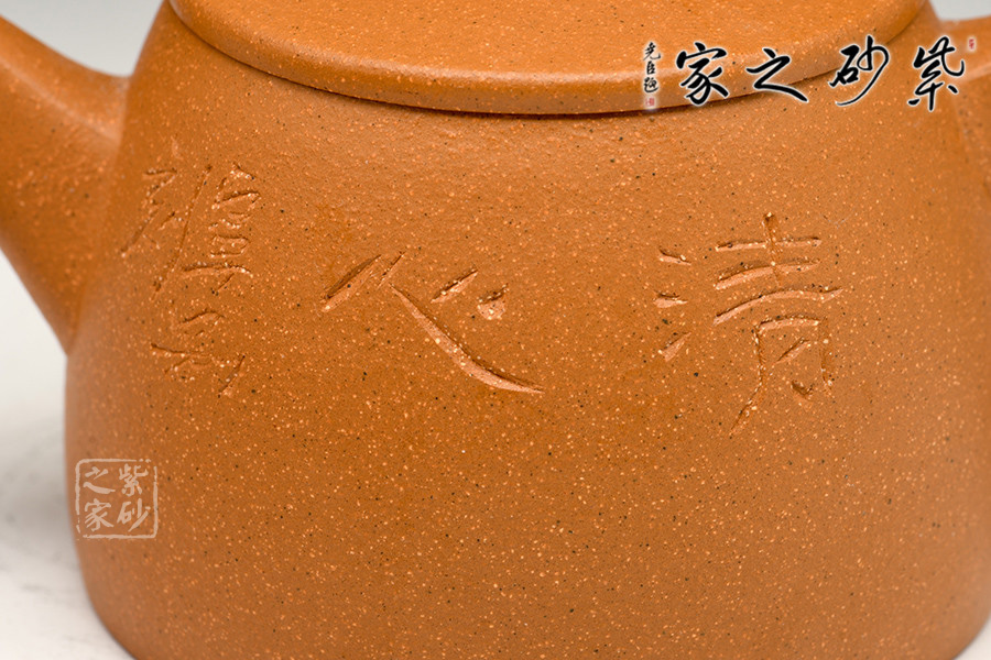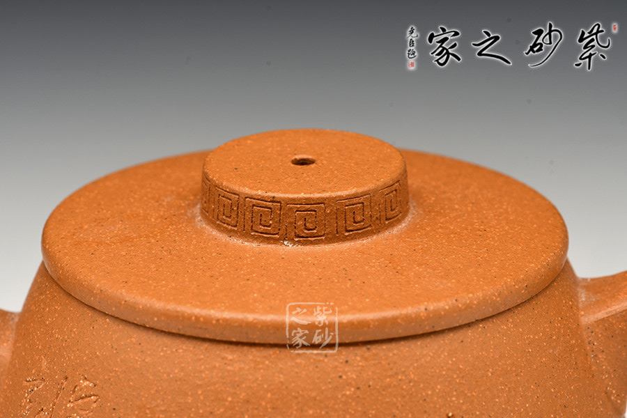此作壺身整體呈現(xiàn)圓柱形體,上斂下闊,平蓋扁柱形鈕,盡顯作品的“大智若拙”的樸拙韻味。細(xì)看,壺鈕四周刻繪有抽象花紋,保證捏拿的同時(shí)也增加了古雅之感。