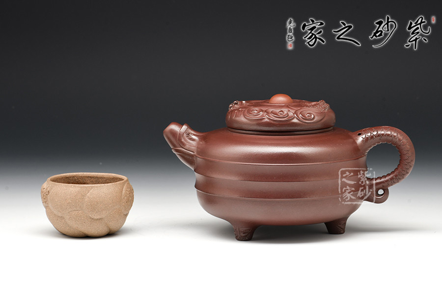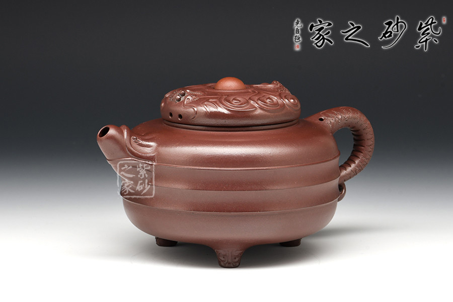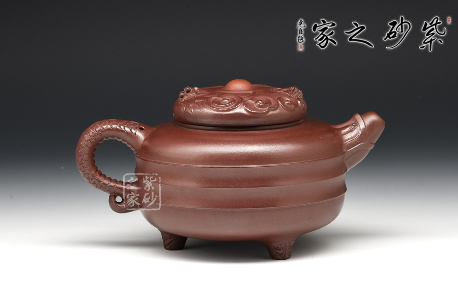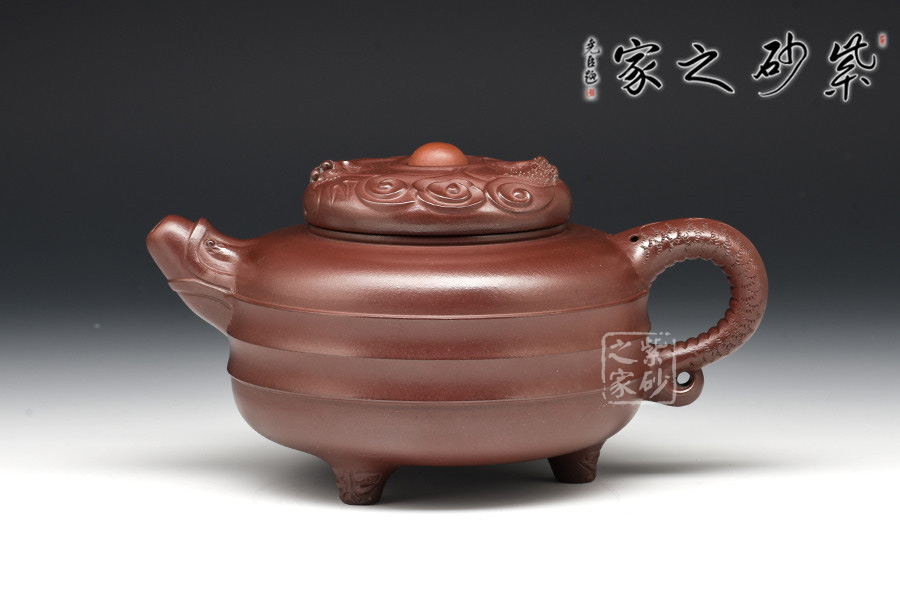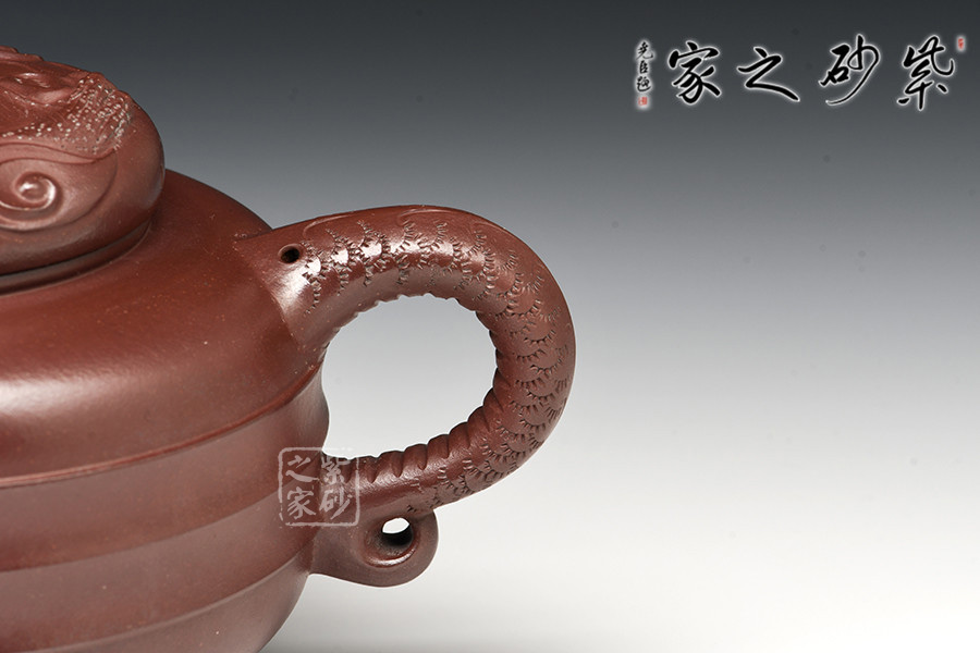 獨(dú)特的造型設(shè)計(jì),讓此款壺看上去霸氣十足。壺嘴、壺把、壺蓋以及三足都采用了中國(guó)傳統(tǒng)神獸“龍”的設(shè)計(jì)理念,細(xì)看似“雙龍戲珠”,活靈活現(xiàn)。壺身的筋紋設(shè)計(jì),似龍身盤(pán)旋,趣味十足,同時(shí)也更具觀賞性。
