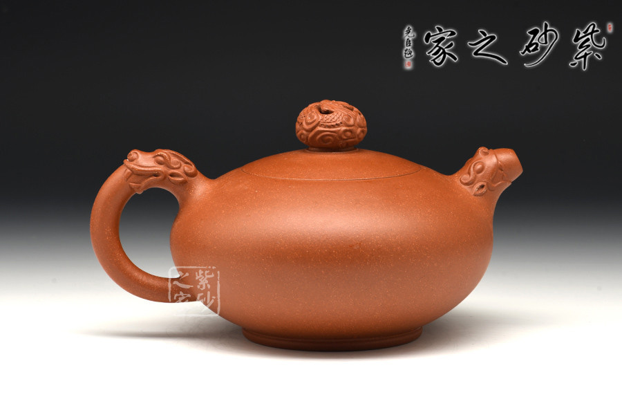 飽滿圓潤(rùn)的扁圓壺身,嵌蓋嵌入其中,整體渾然天成。加一雙龍雕盤(pán)居在壺的雙臂,即壺嘴、壺把,首尾呼應(yīng),呈“龍吐水”之形,充分表現(xiàn)神龍之霸氣,實(shí)屬妙哉。